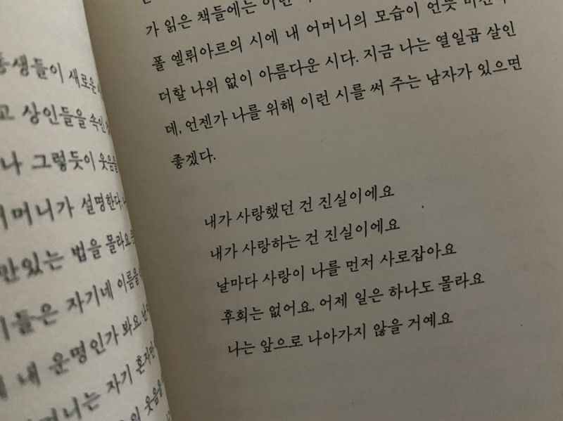 이상하다. 아니, 전혀 이상하지 않다. 단 한 순간도 로망에게 돌아가 문을 두드릴 생각을 하지 않았다는 사실이. 그건 어쩌면 내 안에 있는 나약함이나 호의 때문일 수도 있다. 그건 마치 내게 무언가를 주면 받지만, 다시 가져가면 더 이상 원하지 않는 것과 같다. 내게는 떠나는 일이 정말 쉽다. 만일 내가 남자였다면 이런 마음을 가진 여자, 이를테면 무정한 여자와 사랑에 빠질 수 있을지 자문해본다. 무정? 아니, 나는 그렇게 말하지 않겠다. 가벼움. 그게 더 낫다. 나는 가벼운 마음을 가지고 있다. 아직 완전히 그렇지는 않지만 그 마음에 점점 가까워지고 있다. 내 마음은 티타티티타티다.