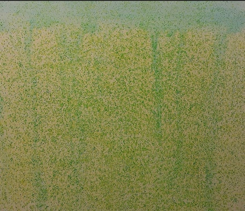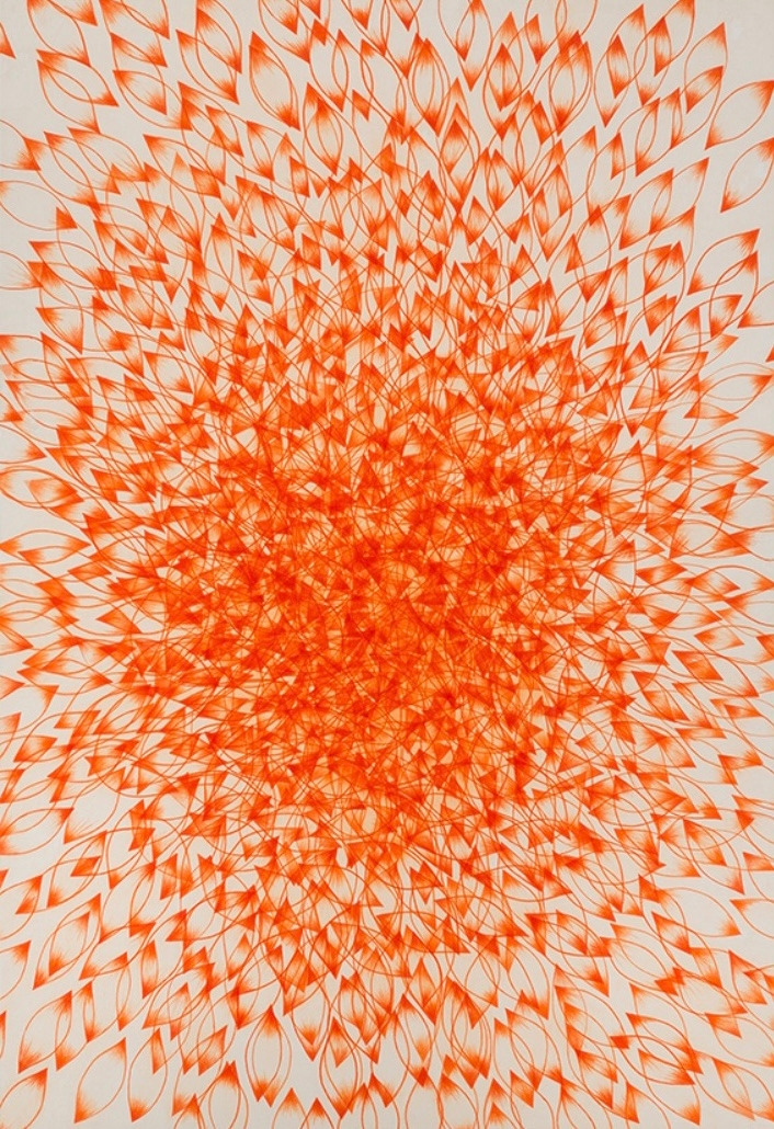 위의 작품 <Orange Blossom> 에는 선명한 오렌지 색 나뭇잎들이 겹쳐지고, 반복됨으로써 비 정형화된 패턴을 만들어내고 있다. 멀리서 전체 화면을 볼 때는 커다란 오렌지 색 꽃이 활짝 피어있고 오렌지 나뭇잎들이 뭉쳐있는 부분이 꽃의 중심부처럼 보이기도 한다. 화면 전체에 나뭇잎들이 골고루 퍼져있어 비구상적 올 오버(all-over) 페인팅의 특성이 나타난다.