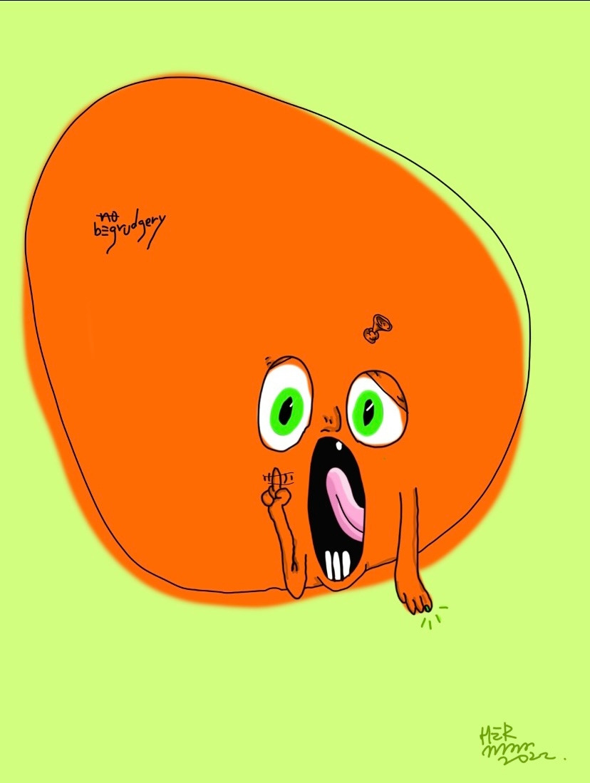 선명한 형광 노란색 배경에 눈부신 오렌지색 니온 컬러로 그려진 <풍선>은 마치 사람의 캐리커처를 그려놓은 듯한 느낌을 준다. 여기서 풍선은 나름의 인격과 생각을 지닌 존재로 나타나며, 디테일한 세부 묘사를 통해 자신의 생각을 관객들에게 전달하려 한다. 바람이 약간 빠진 듯 타원형의 형체를 지닌 선명한 오렌지색 풍선은 커다랗게 입을 벌리며 "나는 누구도, 무엇도 부럽지 않다"는 의미로 No begrudgery라는 글자를 몸에 새기고 있다. 풍선은 단호한 표정으로 "나는 나대로 예쁜 오렌지색을 지닌 완벽한 풍선이므로 내 삶에 만족하고 있다."라고 말한다. 그렇지만 살짝 자신이 없었는지 No 글자 위에 작대기를 하나 그어 놓음으로 실상은 부러움과 질투가 그 안에 존재하고 있음을 보여준다. 풍선의 한쪽 손가락 끝에 아름답게 칠해진 네일 아트는 더욱 풍선의 자존감을 높여주는 기능을 해주고 있다. 이런 세부묘사들에는 헤르만 특유의 유머감각과 재치가 잘 묻어있다.