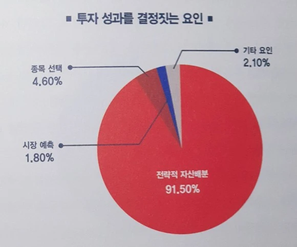 우선 자산배분 투자의 수익률에 대한 의심을 줄이고 넘어 가야할 듯 하다. 1986년 미국의 투자가인 게리 브린슨이 90개 이상의 연기금의 10년치 투자 실적을 분석했다. 그 결과 "자산 배분이 투자 성과의 91.5%를 결정한다"는 내용의 논문을 발표했다. 종목선정이나 시장 예측은 아주 미미한 영향을 끼쳤다.