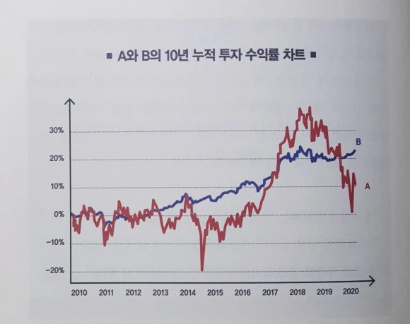 위 그래프는 투자스타일이 전혀 다른 두 사람의 누적수익률을 나타낸 것이다.