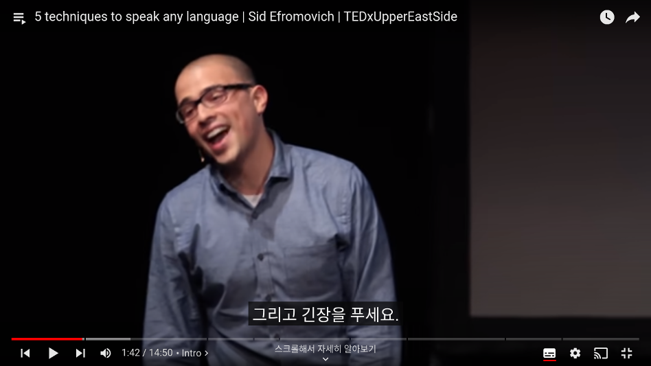 그러던 중, TED 영상 중 하나인 "5 techniques to speak any language (어떤 언어로든 말하는 5가지 테크닉)"를 보았다. 발표자 "Sid Efromovich"는 7개 국어를 할 수 있었고, 5가지 테크닉을 순서대로 설명하였다. 그런데, 첫 번째 테크닉에 대한 설명이 전혀 이해가 되지 않았다. 다음은 그의 설명이다.