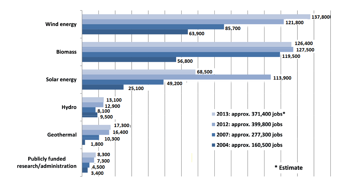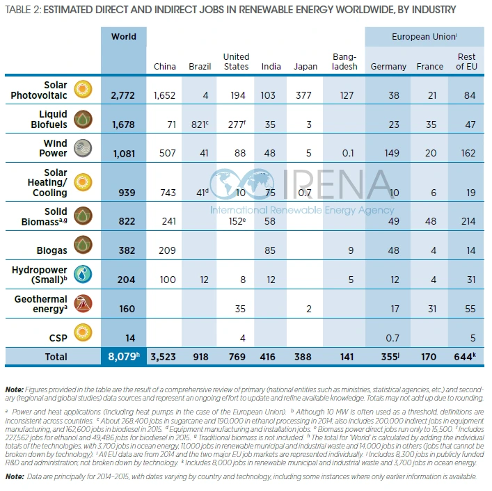 신재생에너지는 기존의 화력발전보다 규모가 적은 곳이 여러 군데 있는 형태가 되다 보니 화력이나 원자력 발전보다 인력이 더 많이 필요합니다. 그리고, 아직 새로운 연구와 시설 건설이 필요하기 때문에 간접 고용에서도 기여가 큽니다.