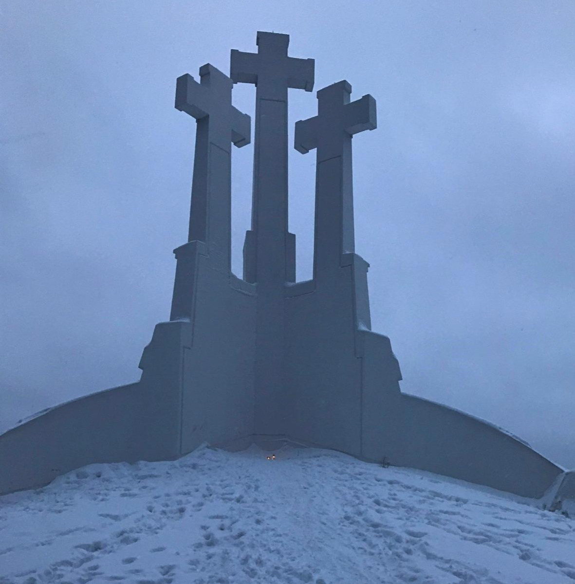 올라가 보지 못한 아쉬움을 빌니아 강을 따라 리투아니아 세 개의 십자가가 있는 공원을 올랐다. 강 주변이라 그런지 폴란드의 추위는 별것 아닌 것처럼 느껴졌다. 한 걸음 한 걸음 천천히 올라 세 개의 십자가가 있는 높은 언덕에 도착할 수 있었다. 흰 눈 쌓인 빌뉴스를 보고 있자니 고요함이 온 도시 전체를 감싸 도는 듯했다. 흰 눈에 흰 하늘과 흰 십자가. 온 세상에 흰 것 말고는 보이지 않았다. 동시에 카메라 전체에 담기도 힘든 세 개의 십자가는 하늘에 닿을 것 같은 경건함을 보였다.보이지 않는 해가 소리소문없이 지기 시작했다.