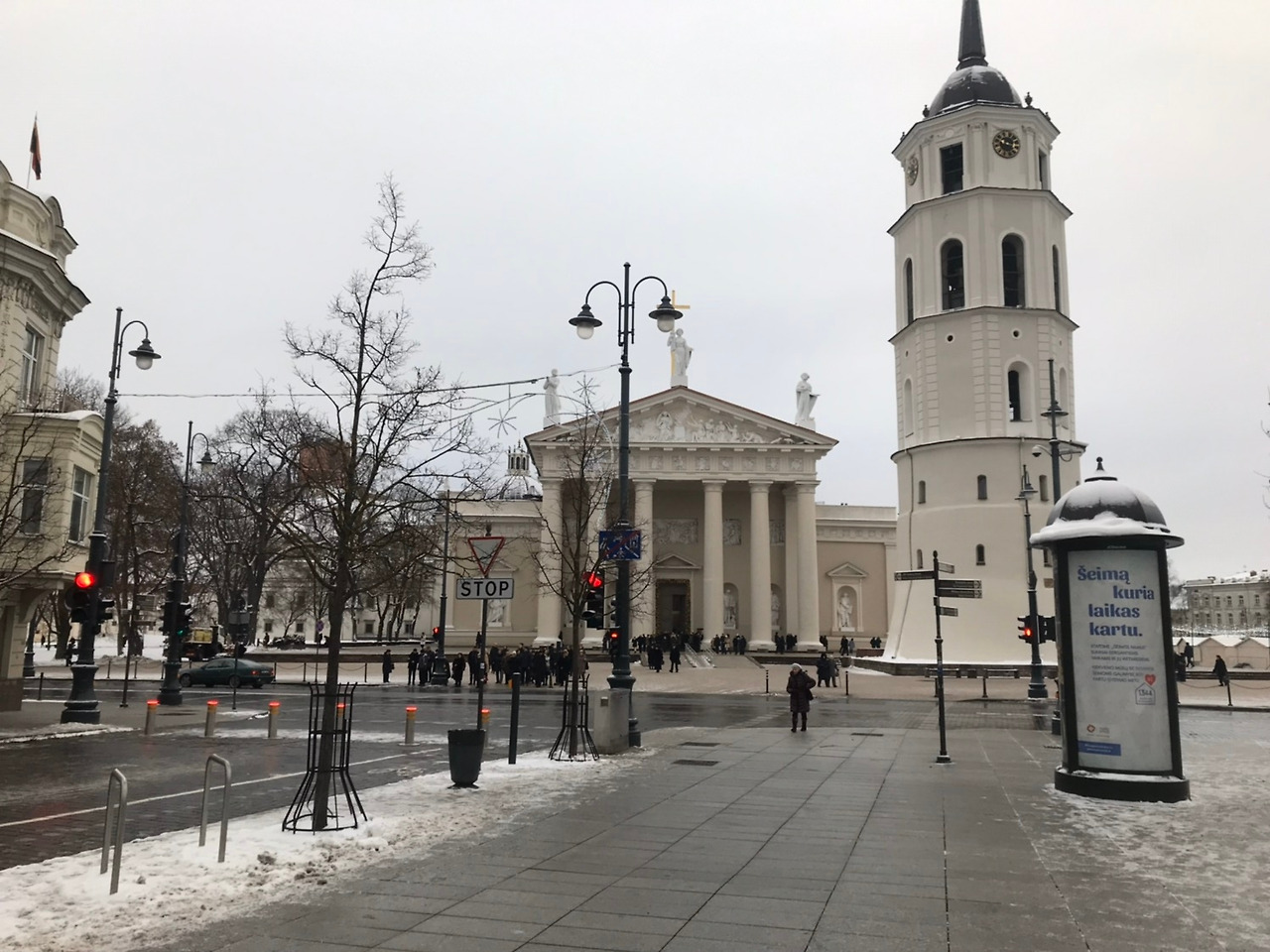 다시 빌뉴스 대성당을 찾았다. 아기자기한 크리스마스 마켓과 가운데 자리 잡은 트리. 사람들이 모인 이곳이 이브의 분위기를 마셨다. 대성당은 그리스의 신전들과 비슷한 구조와 주축 기둥이 건축양식을 빌려온 듯, 어마어마한 크기를 자랑했다. 그리고 대성당에 가려진 더 거대한 궁전이 눈길을 사로잡는다. 또한, 그것보다 더 높은 언덕의 게디미나스 성에 걸린 리투아니아의 국기가 휘날리는 모습이 이 모든 것들의 대미장식이었다. 어두운 날씨 속에서 어두운 색으로 빛나는 빌뉴스의 중심이었다. 게디미나스 성은 줄곧 공사중이었다.