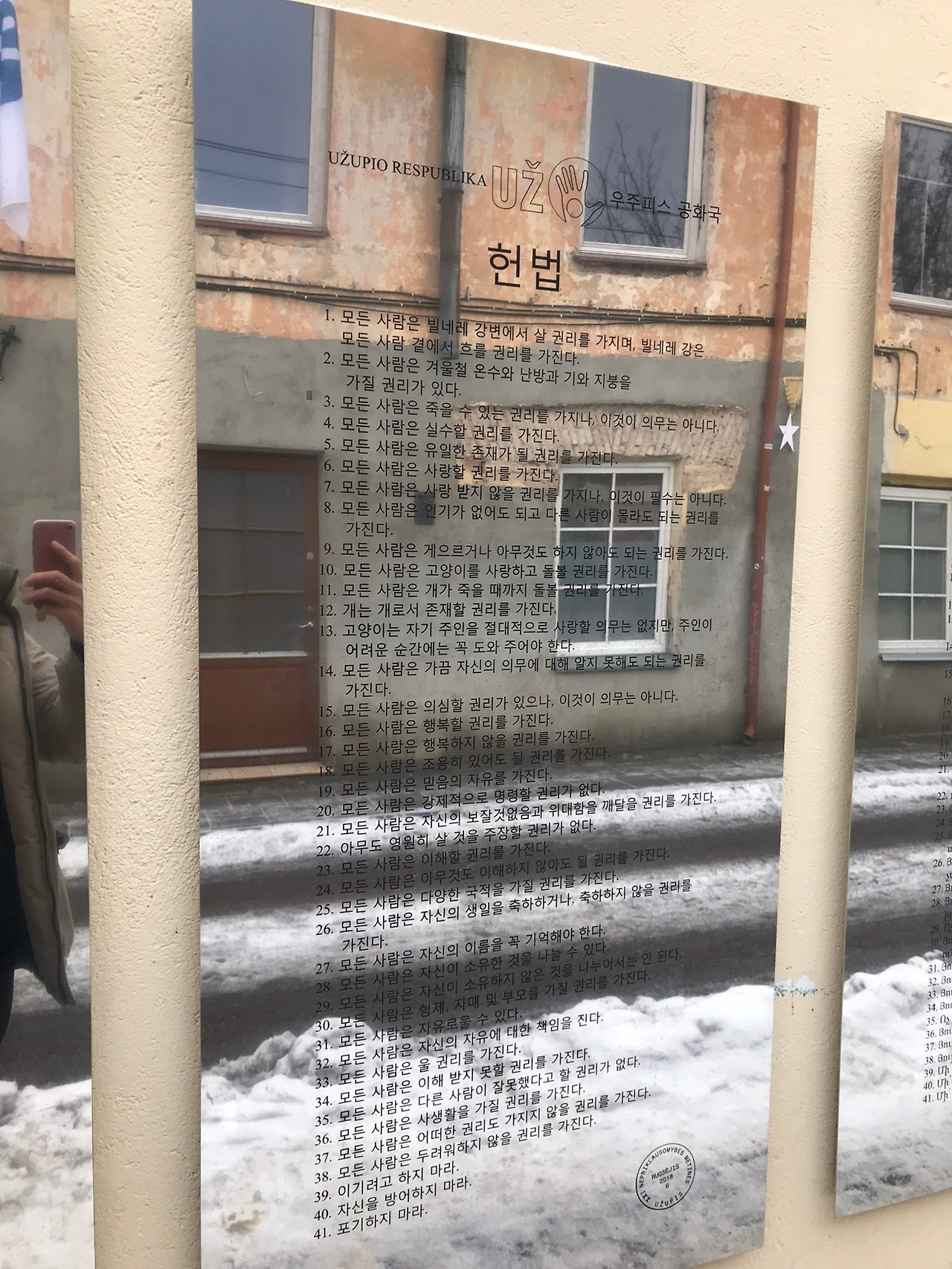 사회 비판적인 목적의 작품들 특히 SNS의 못난 모습들을 간접적으로나마 드러내고 싶었던 이들의 감정을 이해하고 공감했다. 충분히 고찰해봐야 할 문제임은 누구나 다 아는 사실일 것이다. 골목을 떠나 조금 더 걷다 보면 우주피스 헌법 전문이 적힌 곳을 발견할 수 있다. 꽤 긴 벽이었는데, 각국의 언어로 번역되어있었고, 우리의 자랑스러운 한글도 한 폭에 자리 잡고 있었다. 참 재밌는 헌법이다. 그들의 헌법 제3조에 의하면, 모든 사람은 죽을 수 있는 권리를 가지나, 이것이 의무는 아니다. 의무가 아니라면 이곳의 사람들은 평생 살 수 있는 권리도 가질 수 있다는 것인가.