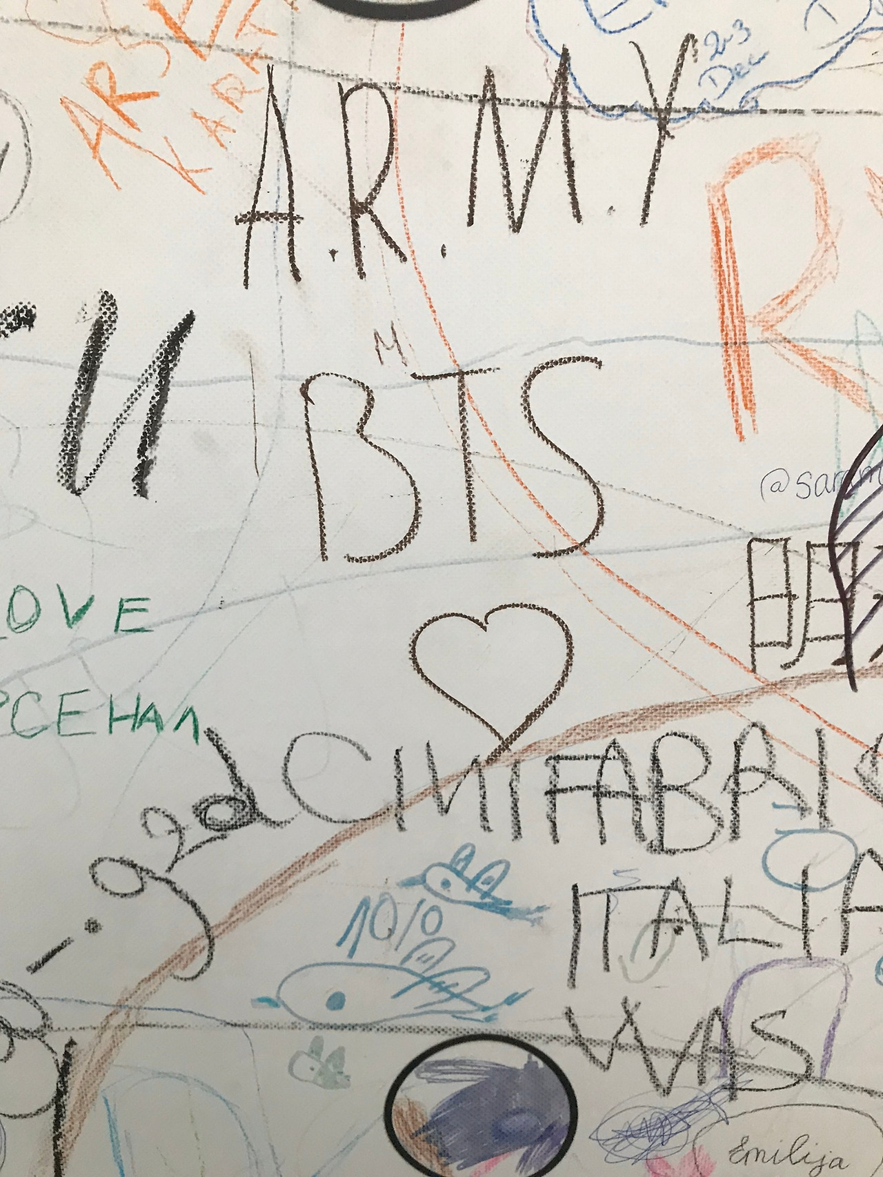 삼성은 출국장의 한 주축 코너를 담당할 만큼 사람들의 눈길을 한 번에 받는 자리에서 기술력을 뽐내고 있었고, 바로 옆 공사를 진행하여 안전을 위해 덮어 놓은 벽에 여러 나라 사람들의 다녀간 흔적을 볼 수 있었다. 그중 BTS 이 한 글자와 하트 문양이 보였다.어딜가나 아미(ami, 방탄 소년단의 팬클럽)가 있구나 하는 것에 뿌듯함을 감출 수 없었다. 나도 질세라 외벽에 ‘안녕!’이라는 인사말을 남긴 채 나의 일상생활로 돌아갈 비행기에 몸을 실었다.
