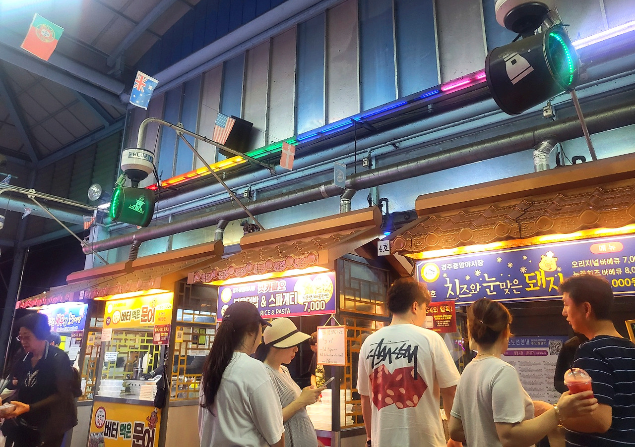 지방 도시의 야시장은 늘 매력적이게 느껴진다. 일본의 몇몇 애니메이션에서 보았던 정감 있는 축제의 모습처럼 낭만을 느끼게 한다. 물론 유흥의 온상지로 변모한 곳들도 많겠지만 경주중앙시장은 그렇지 않았다. 지역민과 관광객이 적절히 어우러져 다양한 먹거리를 즐기는, 절제된 분위기였다.
