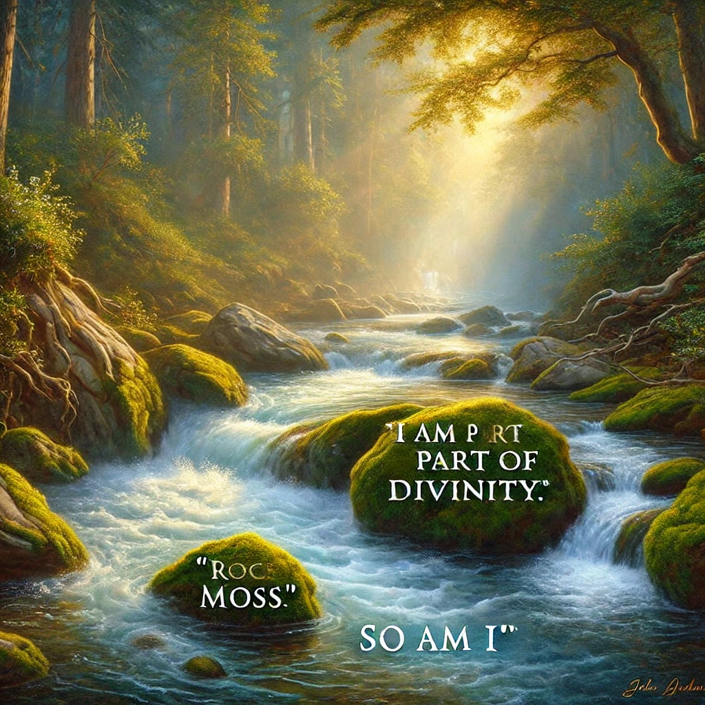 우리는 어디에서 와서 어디로 가는지 알 수 없으며 그저 때가 되면 떠나야만 한다는 사실을 알 뿐이다. 이러한 존재의 수수쎄끼와 유한성은 삶을 신비롭고 소중하게 만들어준다. 또한 모든 존재는 생명과 소명, 거듭남의 신성한 법칙에 지배되면서 그 법칙을 구현하기에 신성함을 지닌다. 그리하여 모든 존재는 "신의 작은 한 조각" "그게 아니더라도 최소한 / 신의 의도와 희망의 작은 조각"이 된다. 강이 "나는 신성함의 일부다"라고 말하자 바위와 이끼가 "나도 그렇다"라고 했듯이 나도 그렇다. 우리는 모두 신성함의 일부다.