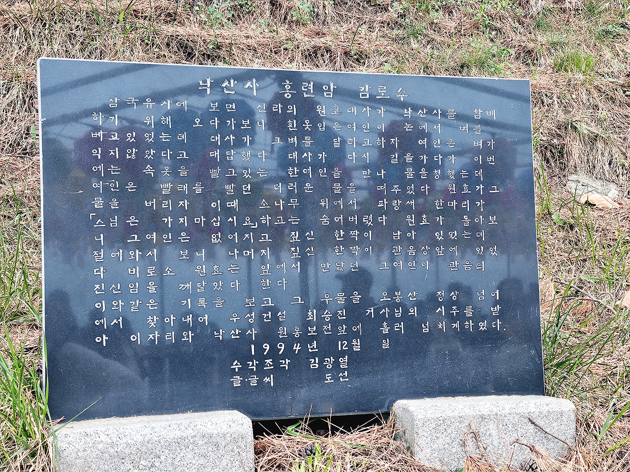 낙산사를 거닐다 발견한 한 비석이 눈에 들어왔다. 요약하면 "원효대사가 낙산사에서 흰옷 입은 여인을 만났는데 그 여인이 벼가 익지 않았다고 말했고, 또 다른 여인은 물을 청한 원효대사에게 빨래를 빨던 더러운 물을 떠주었다"는 내용이다.