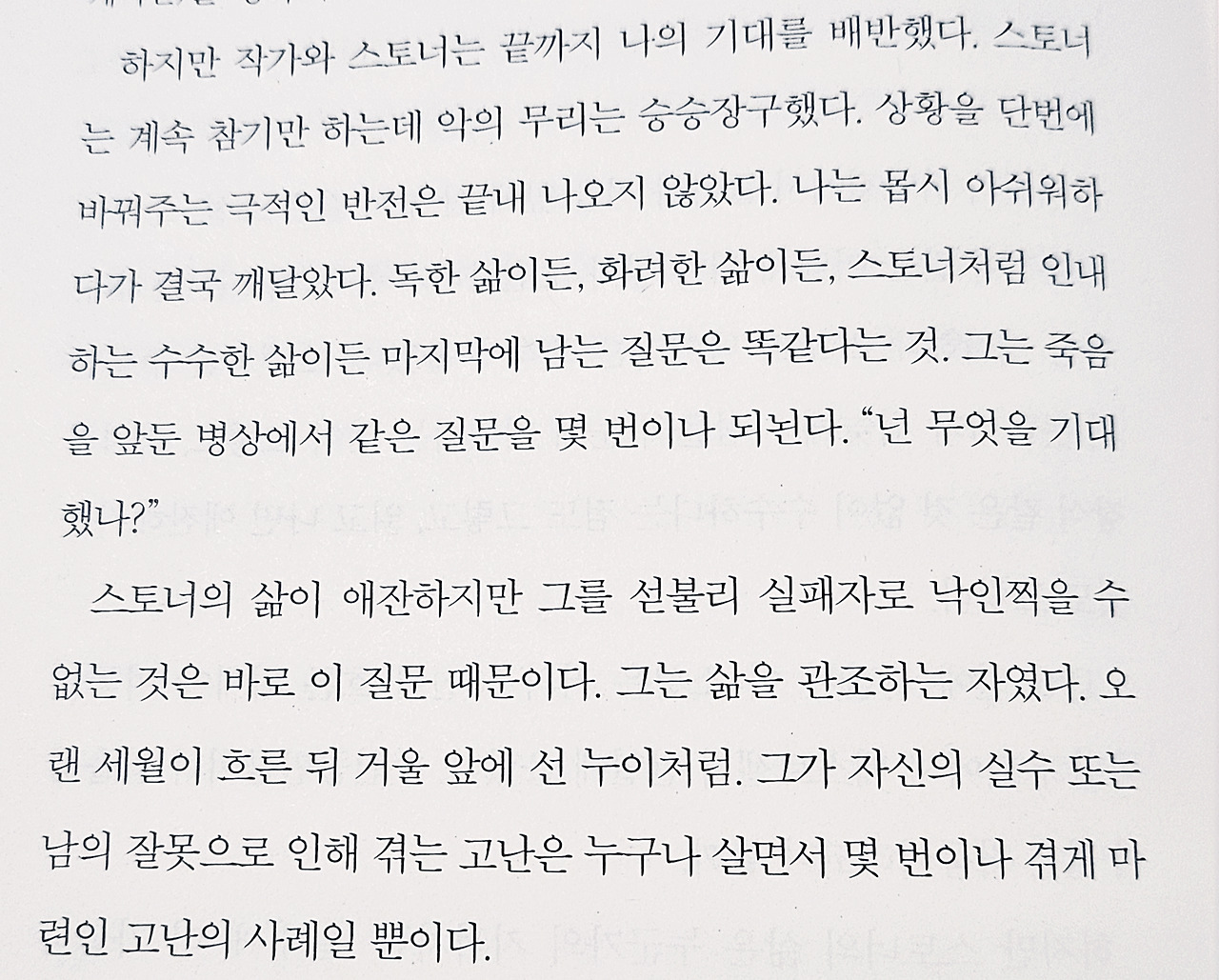 하지만 그럼에도 이 소설은 우리를 강하게 끌어당긴다. 너무 평범해서 때론 그 속에 담긴 일상에 매료되고, 어쩌면 우리 또한, 또 하나의 스토너로 살아가고 있는 건 아닌지 고민하게 된다. 그저 주어진 평범한 삶, 그 속에서 받는 공감이 이렇게나 따뜻했었는지 다시금 느끼게 해 준다.