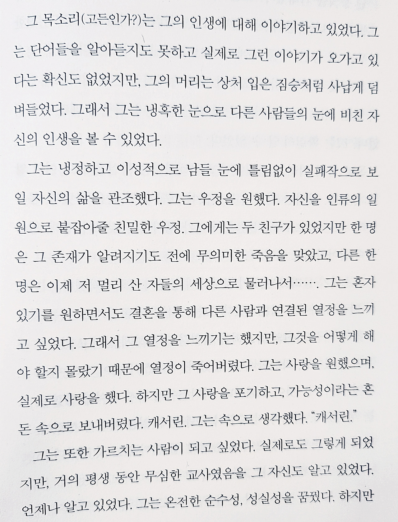 이 작품은 전혀 소설 같지 않은 소설이다. 지극히 평범한 한 대학교수의 삶을 다루고 있는데 그마저도 극적인 서사보다는 순조로운 일상의 연속이다. 물론, 현실에서는 대학교수가 되는 것도 어려운 일이지만 어디서든 한번쯤 만날 수 있고 접할 수 있는 삶이라는 점에서 특이하다고 보기는 힘들다.