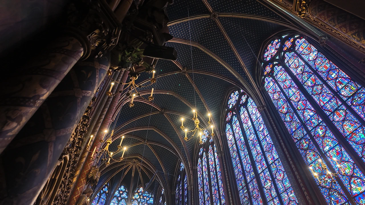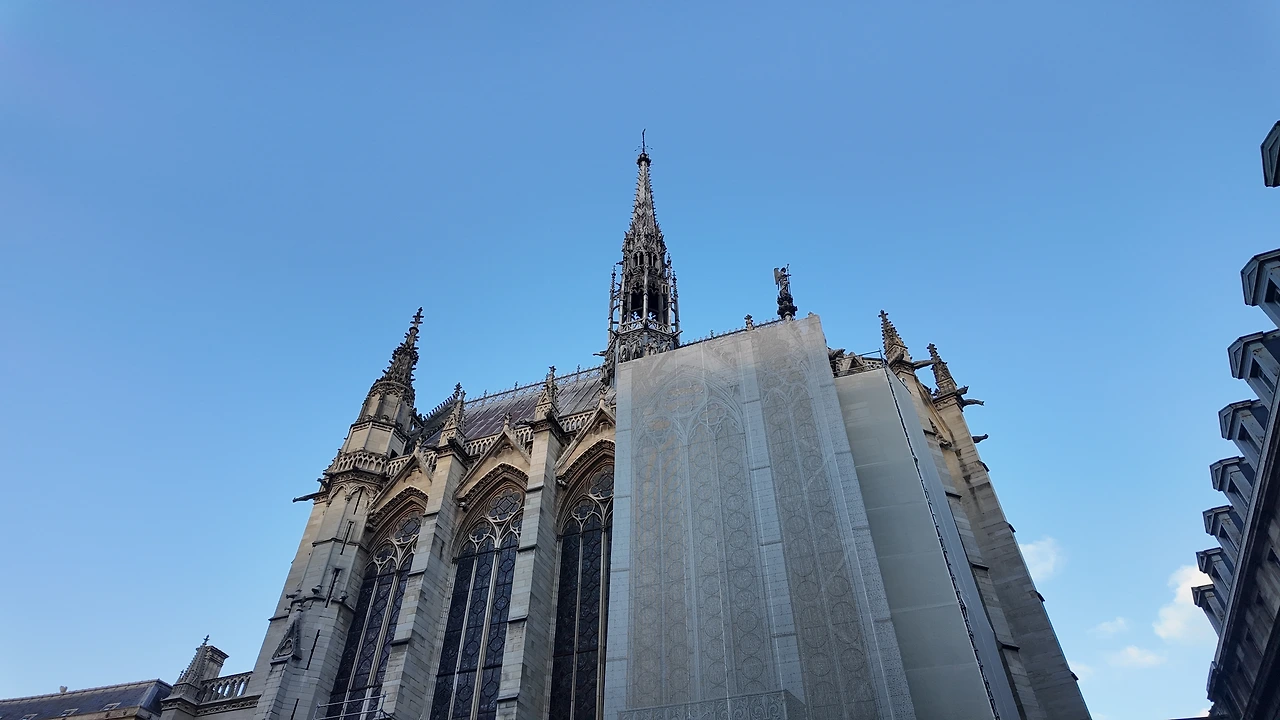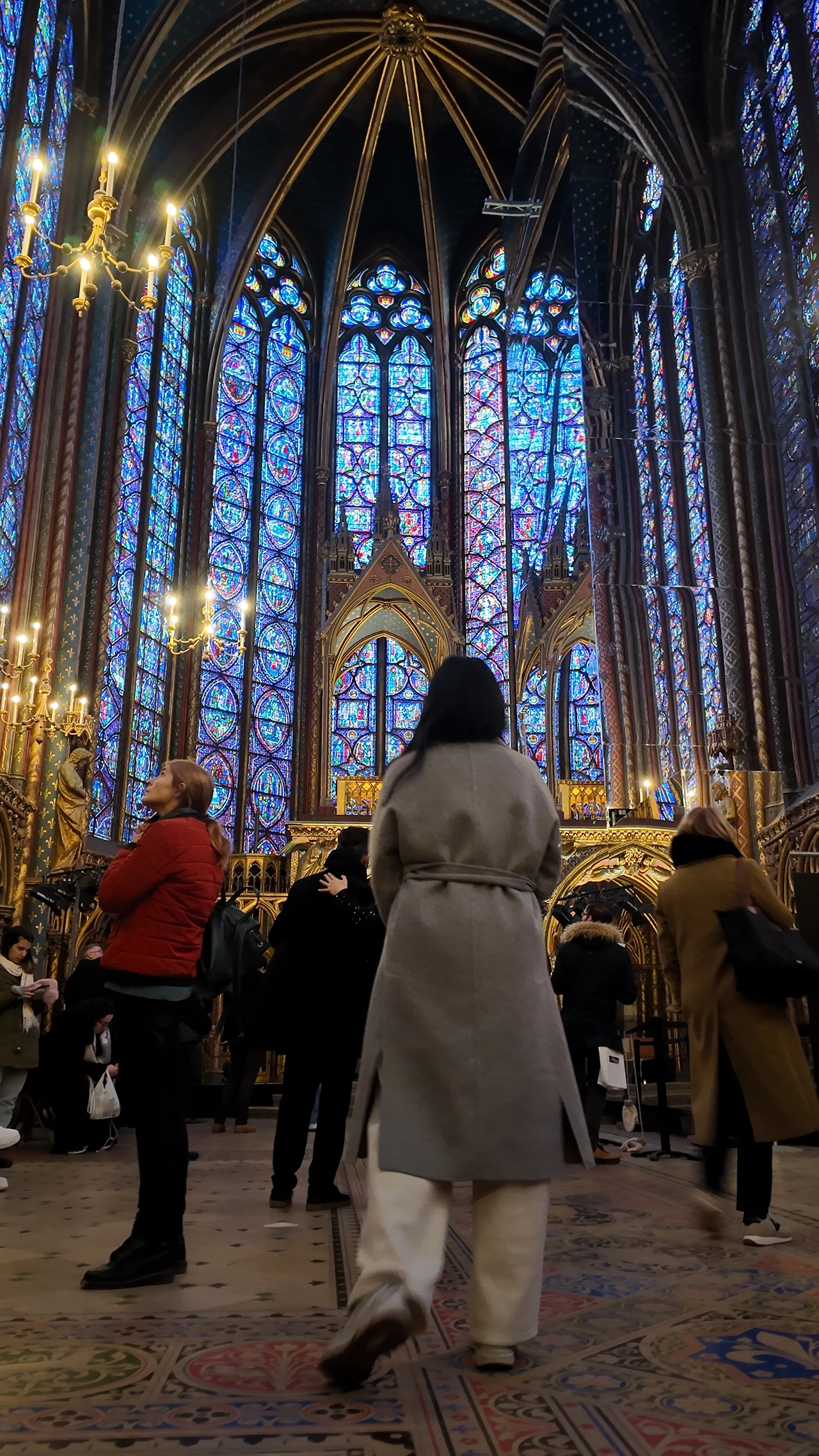 파리 1구의 중앙에 위치한 생트샤펠 성당은 고급스러움 그 자체다. 여러 건물 사이에 둘러싸여 있어 멀리서는 선명히 보이진 않았다. 하지만 지붕이 뾰족하게 솟아 다른 건물과는 확연히 차이가 난다. 생트샤펠의 창에는 스테인드글라스로 만든 화려한 그림들이 그려져 있다. 가지만 무려 1000개가 넘는데 구약성서의 장면과 예수님의 가시면류관 조각 같은 성유물을 성당으로 가져오기 위한 여정들이 기록돼 있다.