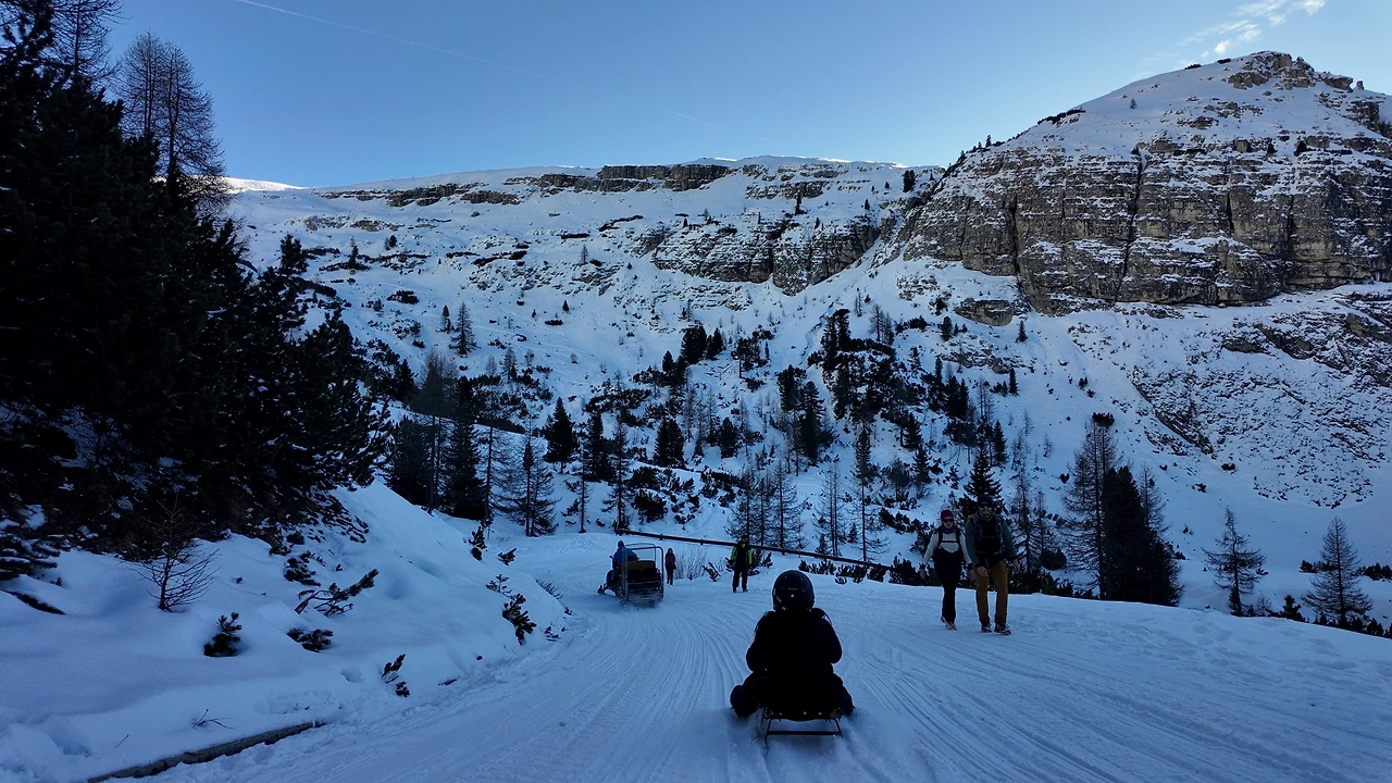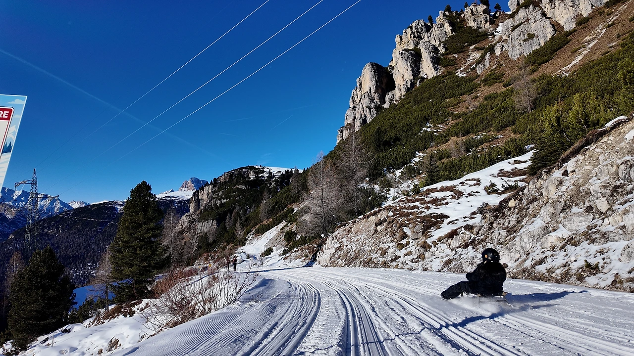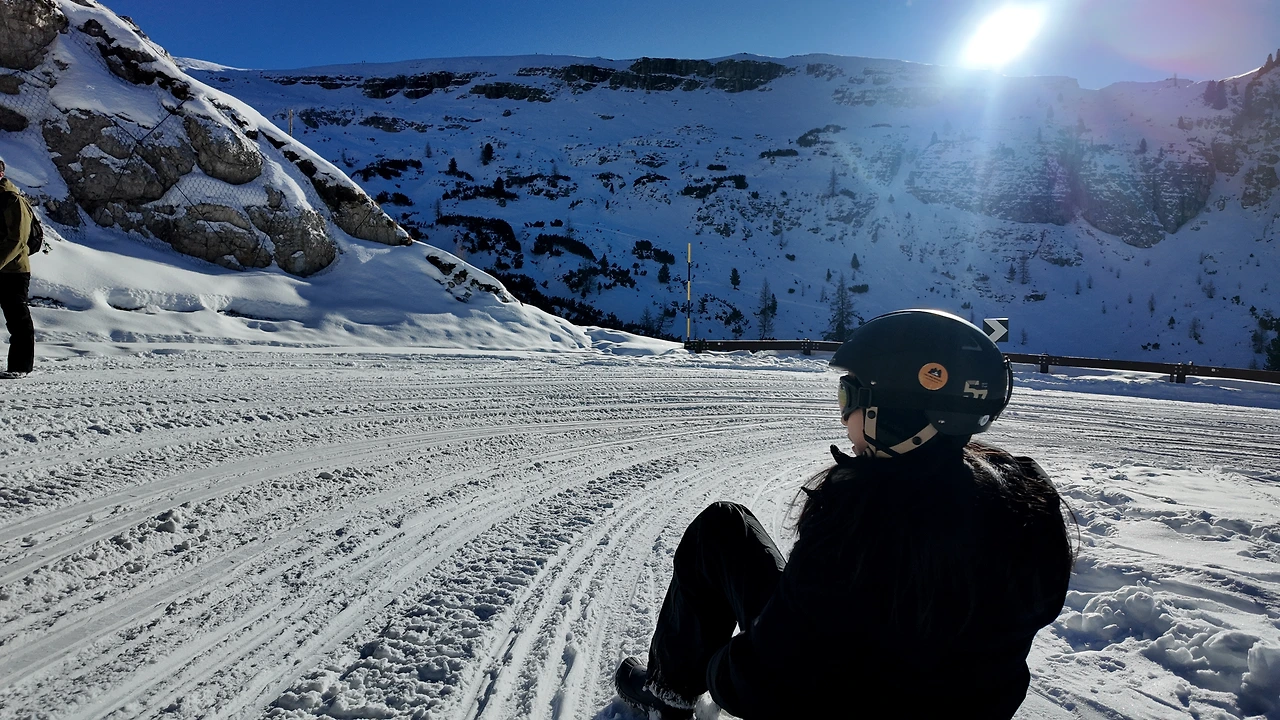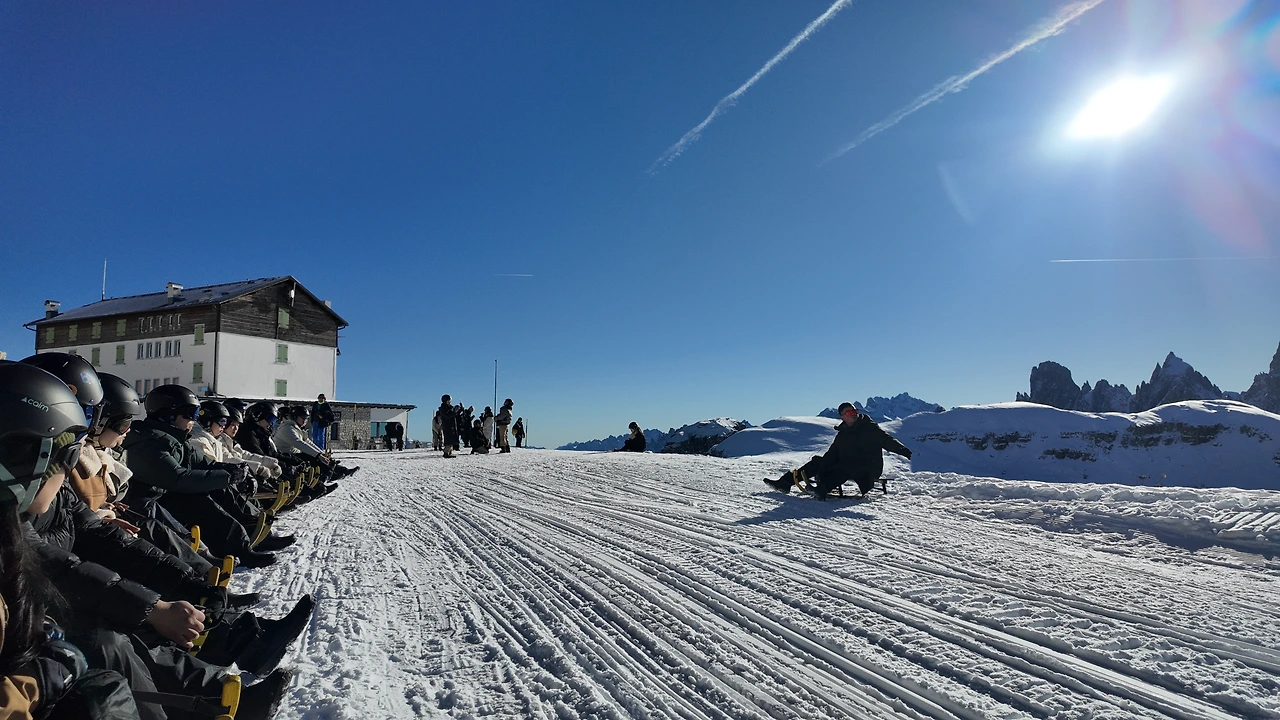 더 깊은 산속으로 들어서자 거대한 침엽수림이 나타났다. 크리스마스트리처럼 길게 솟은 나무들이 햇살에 몸을 말리고 있었다. 짙은 녹색과 회색이 묘하게 조화를 이뤘다. 돌로미티 투어의 핵심 중 하나는 '눈썰매'였다. 그녀도 나도 액티비티를 워낙 좋아하기에 결코 포기할 수 없었다. 여행 중 가장 즐거운 순간 중 하나였다. 전동 썰매 오토바이를 타고 해발 3000m선까지 올랐다.