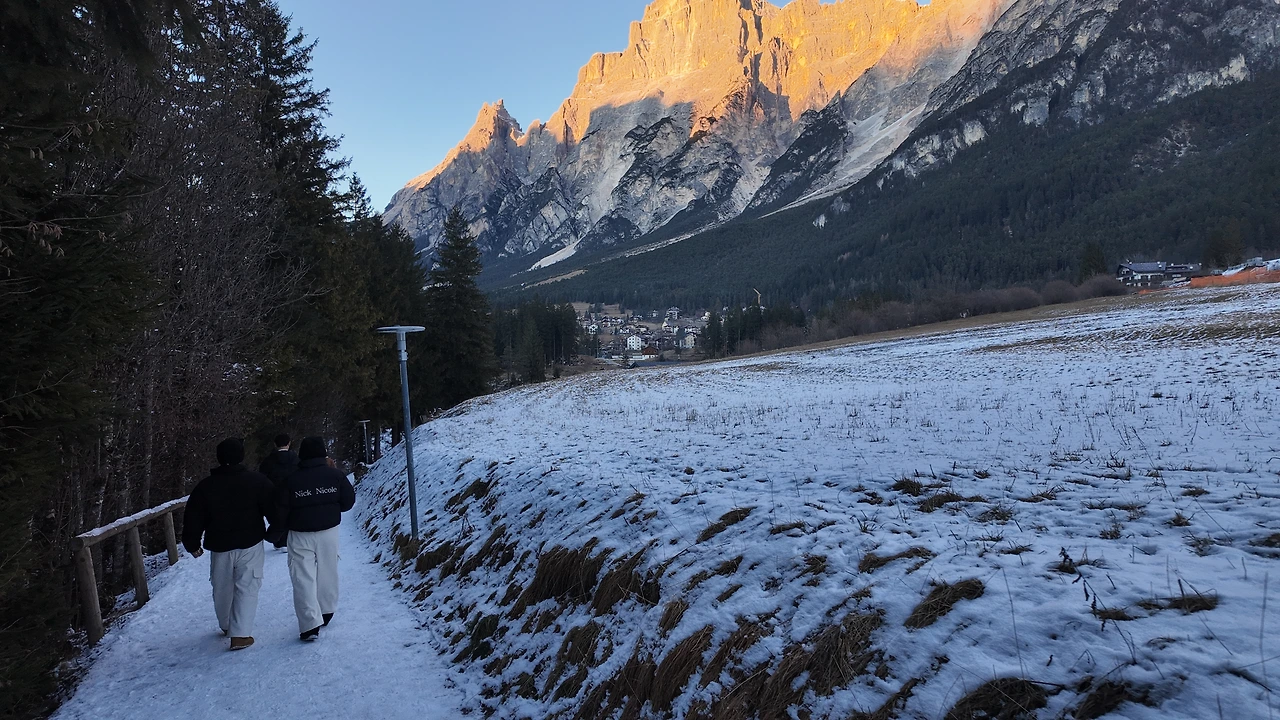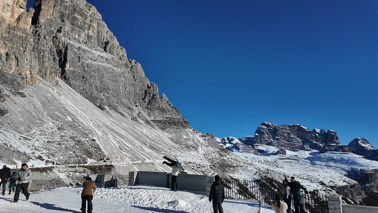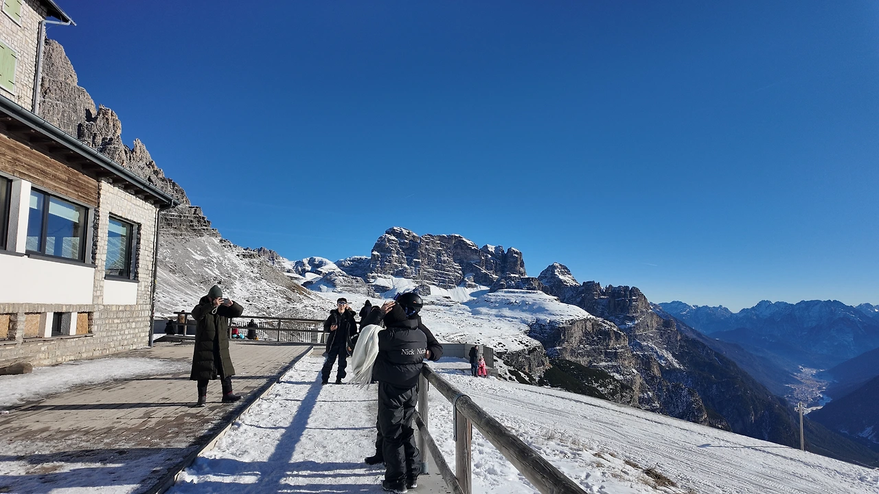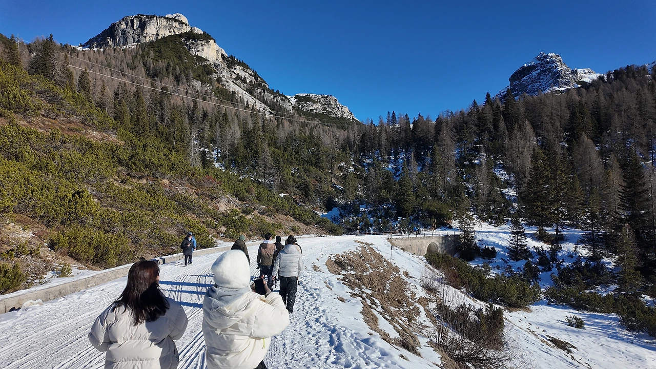 20분여 산 정상을 향해 달렸을까. 돌로미티가 보이는 정상자락이 보였다. 숙소로 보이는 큰 나무집 하나가 있고 주변은 온통 눈으로 둘러싸여 있었다. 공기는 고요했고 바람은 잔잔했다. 그 사이를 햇살이 가득 채웠다. 거대한 성 같은 회색의 산봉우리들이 사방에 솟아 있었다. 아름답고 또 행복한 순간이었다. 일행들과 기념사진을 찍으며 잠시 숨을 들이켰다. 능선 아래로는 트래킹을 하는 사람들이 눈길 사이를 오르고 있었다. 자연이 빛은 장관이었다.