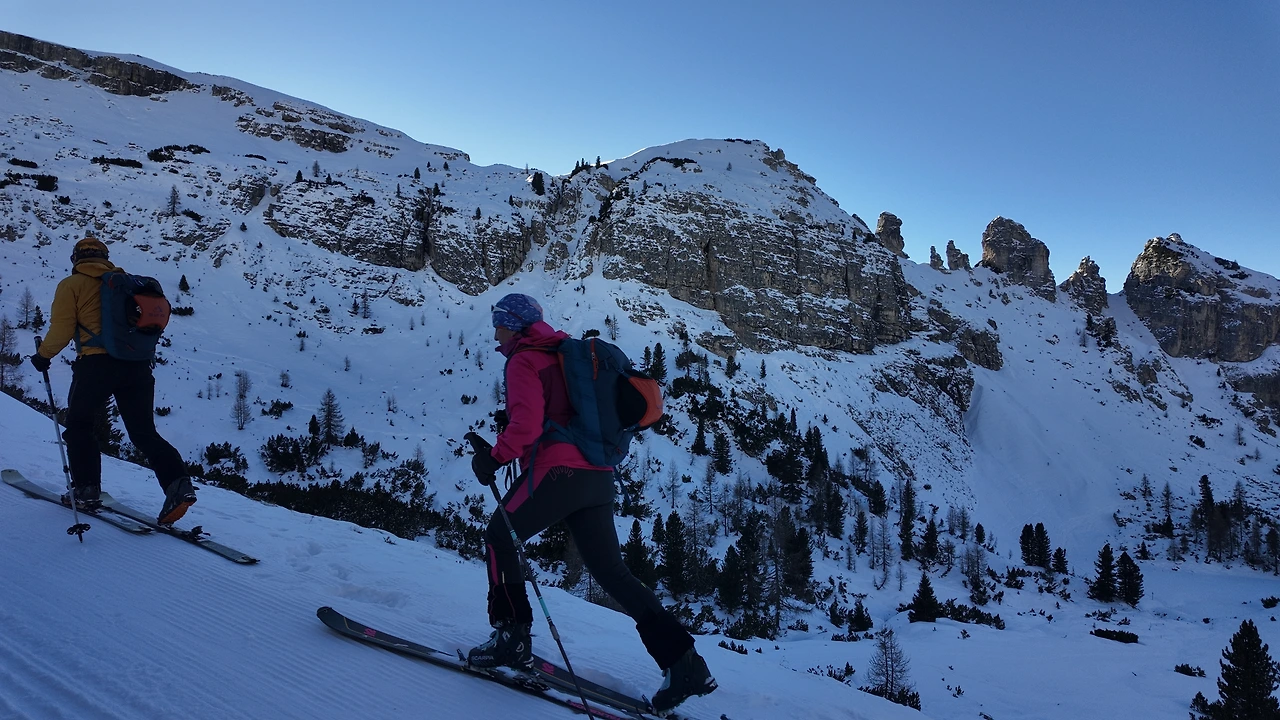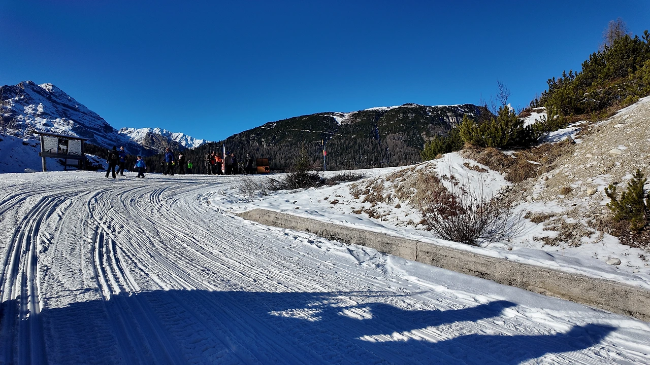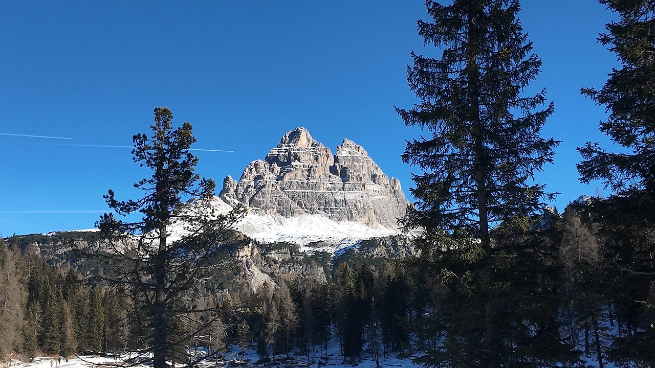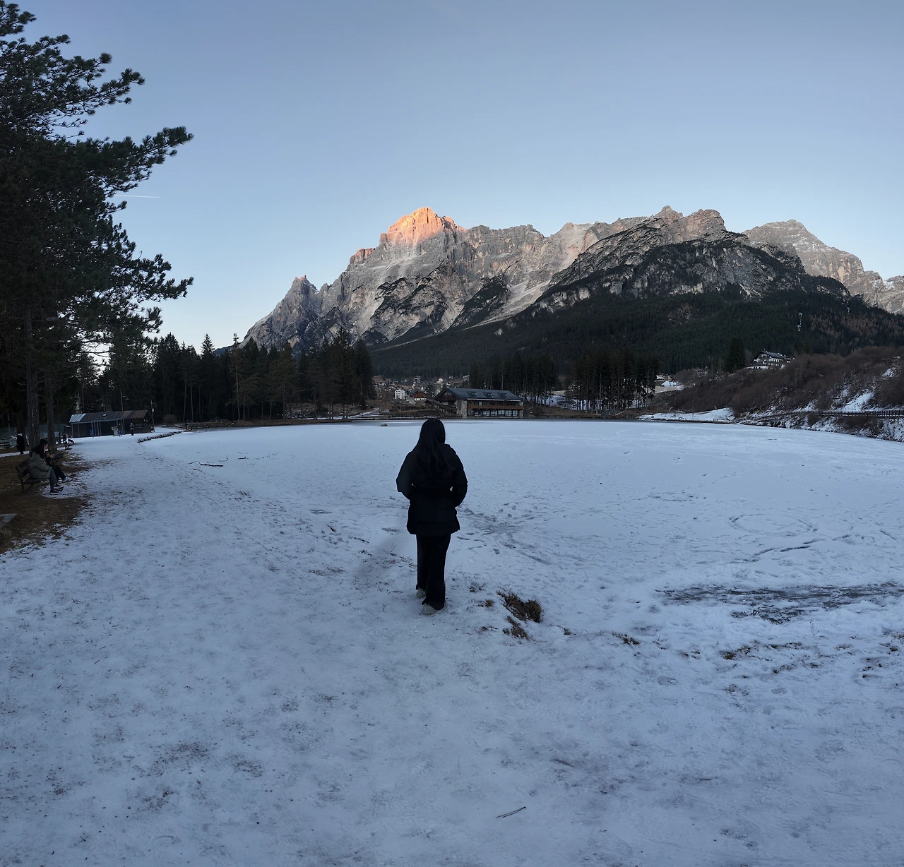 20분여 산 정상을 향해 달렸을까. 돌로미티가 보이는 정상자락이 보였다. 숙소로 보이는 큰 나무집 하나가 있고 주변은 온통 눈으로 둘러싸여 있었다. 공기는 고요했고 바람은 잔잔했다. 그 사이를 햇살이 가득 채웠다. 거대한 성 같은 회색의 산봉우리들이 사방에 솟아 있었다. 아름답고 또 행복한 순간이었다. 일행들과 기념사진을 찍으며 잠시 숨을 들이켰다. 능선 아래로는 트래킹을 하는 사람들이 눈길 사이를 오르고 있었다. 자연이 빛은 장관이었다.