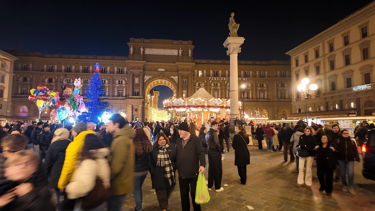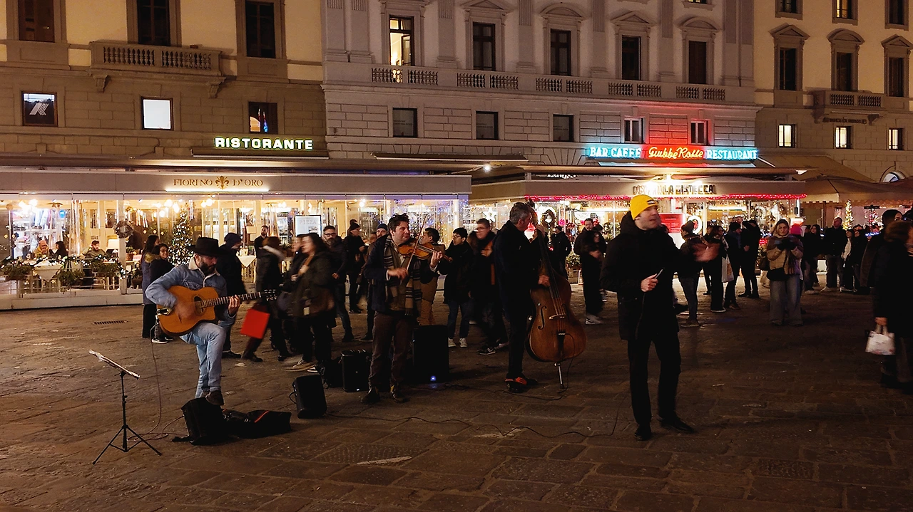 아카데미아 미술관에서 영감에 취한 채 나오는데, 벌써 해가 졌다. 하지만 도시는 온통 밝았다. 연말, 축제, 네온사인까지. 피렌체 상권의 중심, 레푸블리카 광장으로 향했다. 버스킹이 한창이었다. 한 명품 브랜드의 이름이 새겨진 백화점 벽에 미디어 파사드가 한 문구를 썼다. 'HAPPY NEW YEAR 2026'. 꽃의 도시에서 밤의 향기가 흩날리고 있었다.