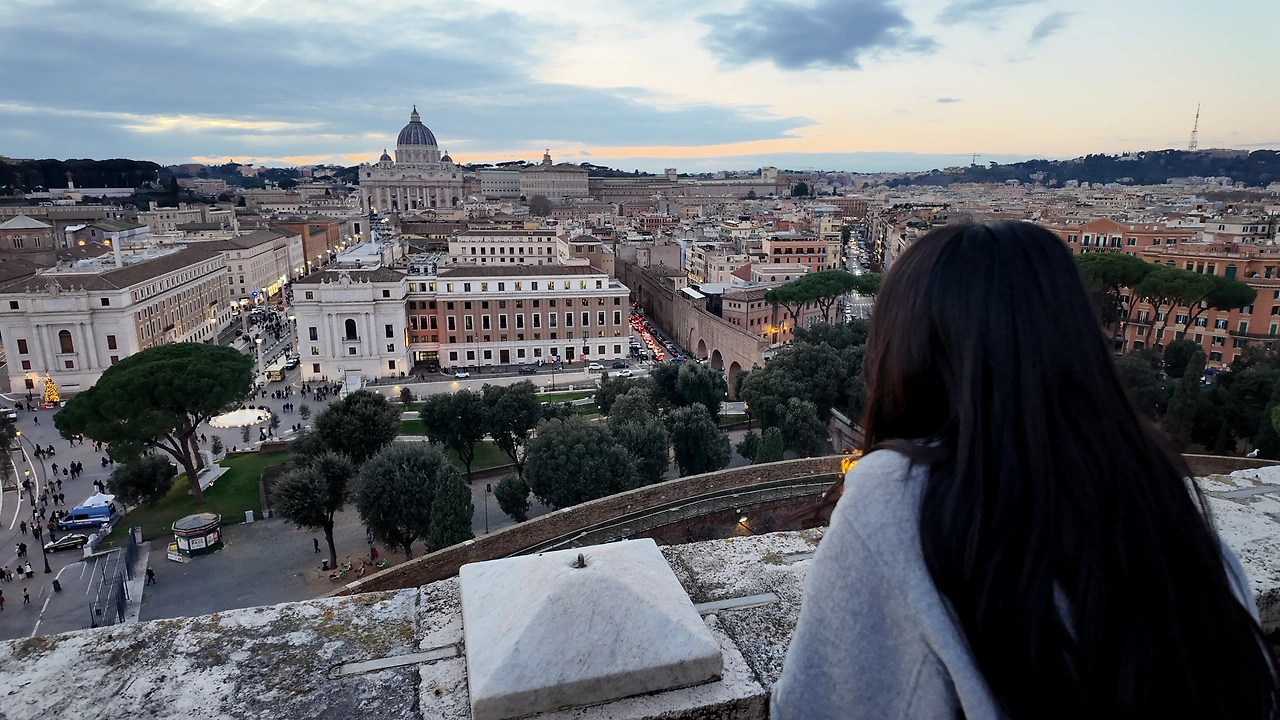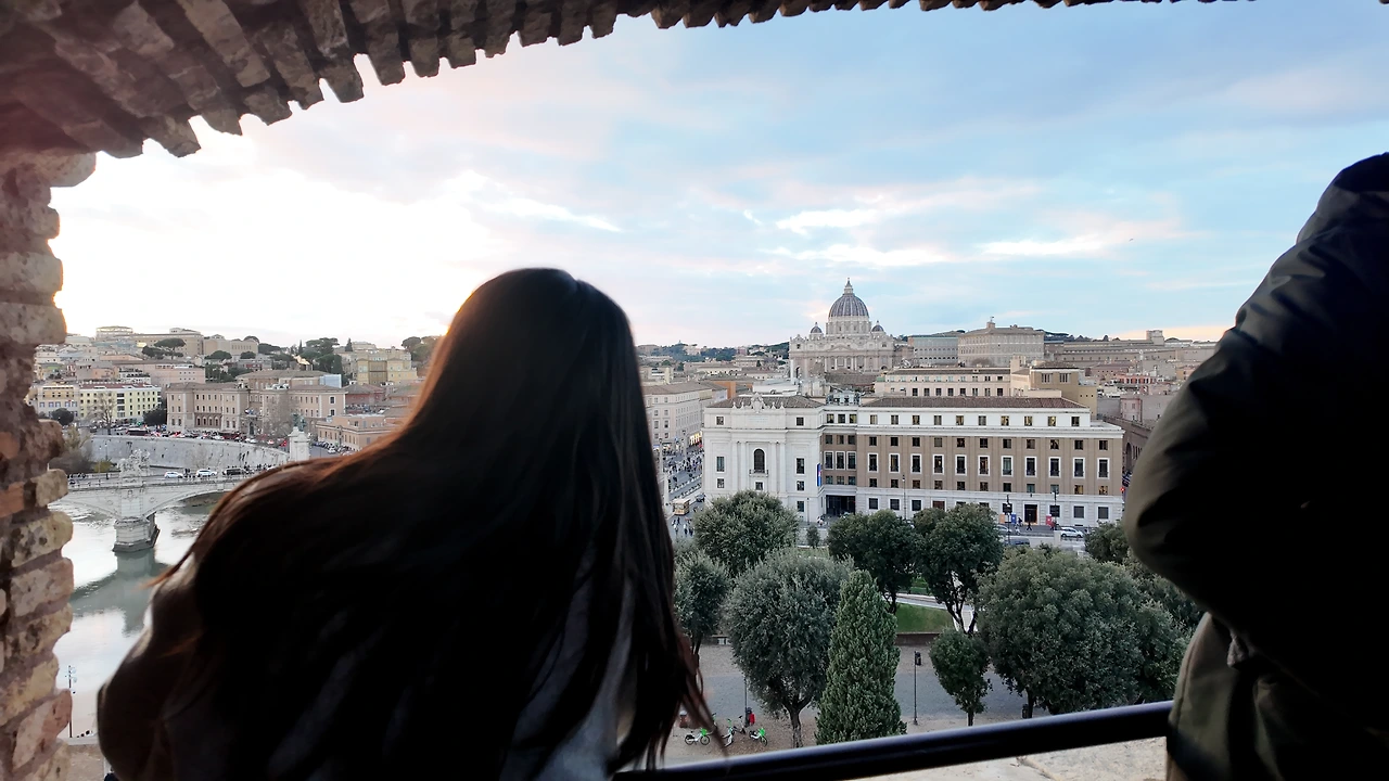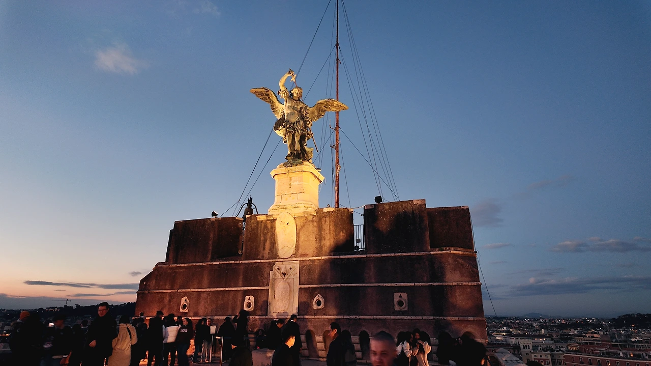 워낙 크다 보니, 성천사성에서는 로마시내를 한눈에 내려다볼 수 있다. 프랑스 파리와는 또 다른 느낌이다. 해 질 녘이라 그런지 분홍빛 하늘과 회색빛의 도시가 절묘한 조화를 이뤘다. 어떤 도시만의 색깔이 있다는 건 정말 멋진 일이다. 서로 다른 역사를 품고 살아왔고, 그래서 서로를 이해하고 또 거기서 무언가를 배울 수 있다는 것이니까.