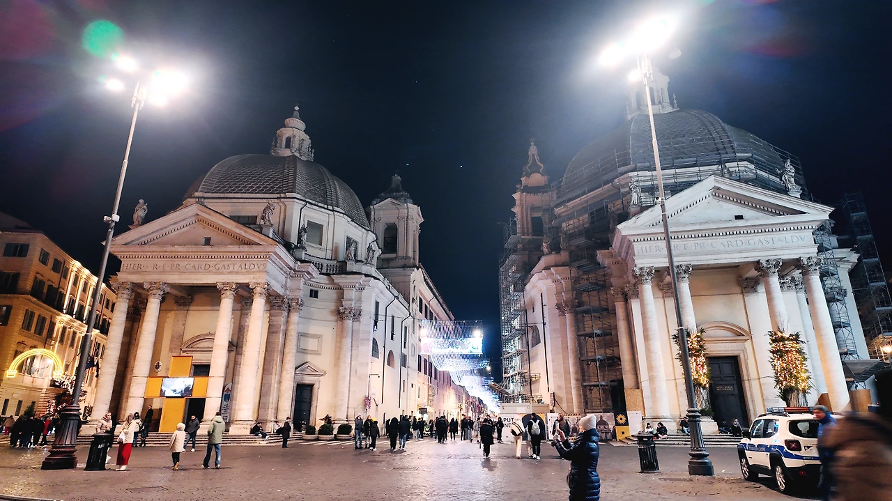 *포폴로 광장 : 포폴로 광장은 로마의 북쪽 관문처럼 서 있는 넓은 광장이다. 중앙에는 고대 이집트에서 가져온 오벨리스크가 솟아 있고, 그 뒤로는 도시로 들어서는 문처럼 포폴로 문이 자리한다. 넓은 부지 뒤로 큰 성당 2개가 자리하고 있다. 밤에는 조명과 광장의 여백이 어우러져 로마 특유의 오래된 장엄함을 드러낸다.