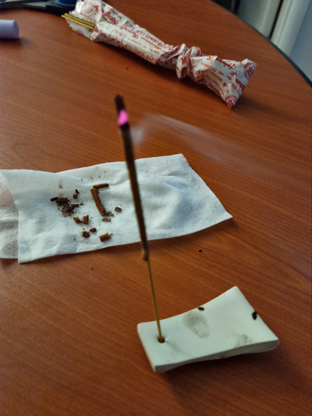 난 잠시 의자에 앉아 멍하니 화장실을 바라봤다. 그런 후 생각을 비우고 화장실을 청소하기 시작했다. 새벽 3시경 청소를 끝내고 자리에 누웠다. 잠이 오지 않았다. 놀랜 마음을 달래려 친구가 생일 선물로 준 향을 피우고 기도를 했다.