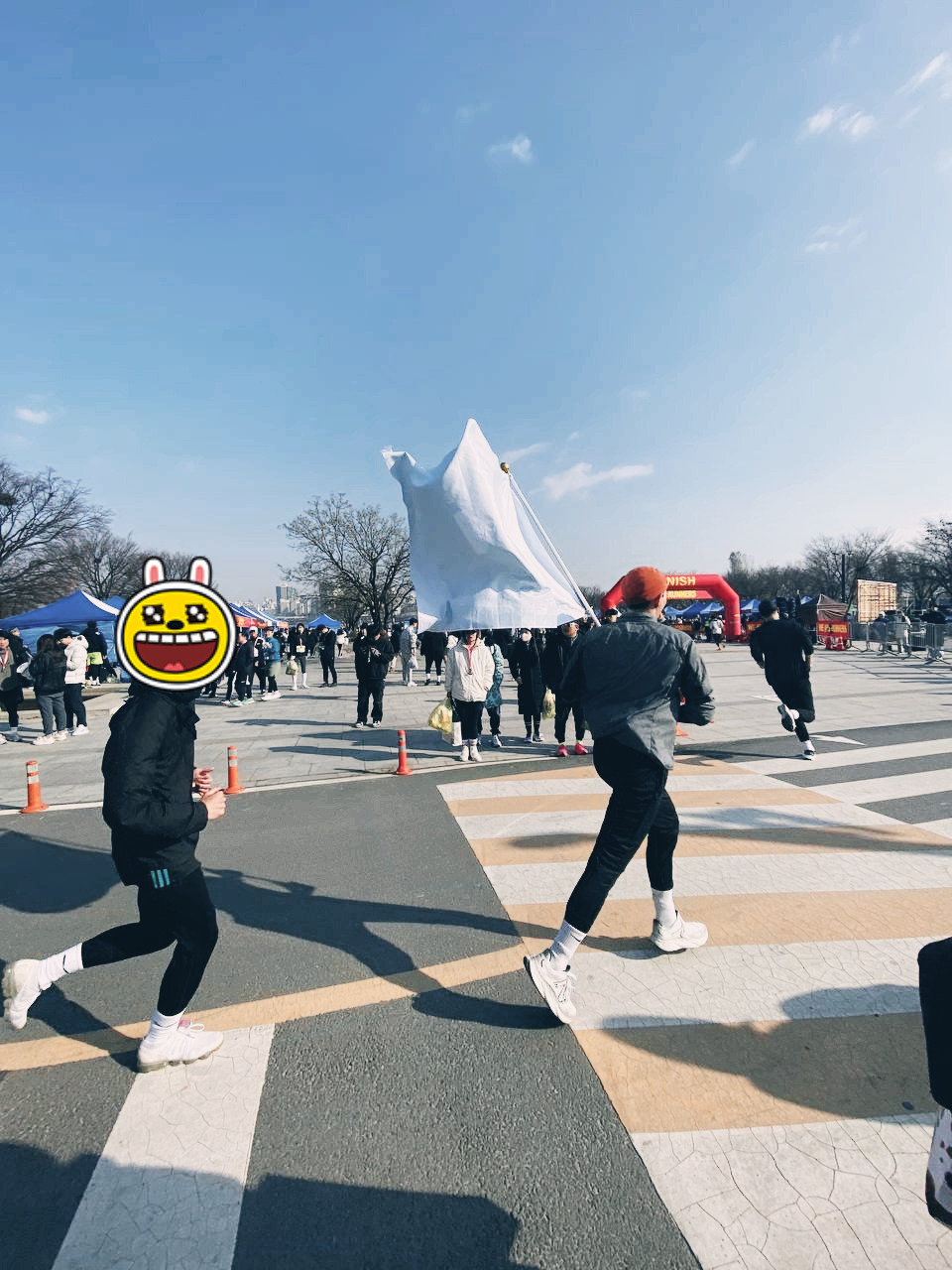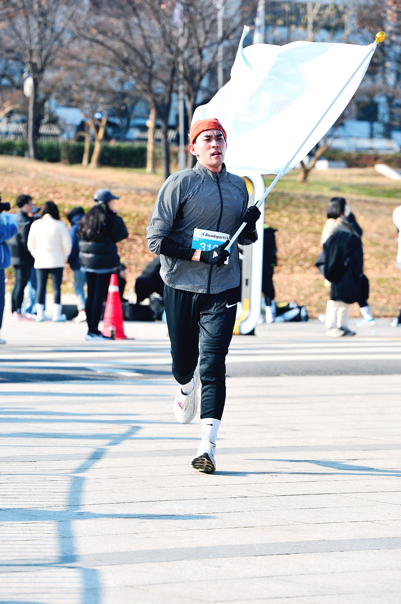 12월 2일(토) 참여한 '위아러너스 : 시즌 마감 레이스 2023'에서 하프코스를 완주하고, 러닝 크루의 깃발을 들고 결승점으로 들어오는 모습