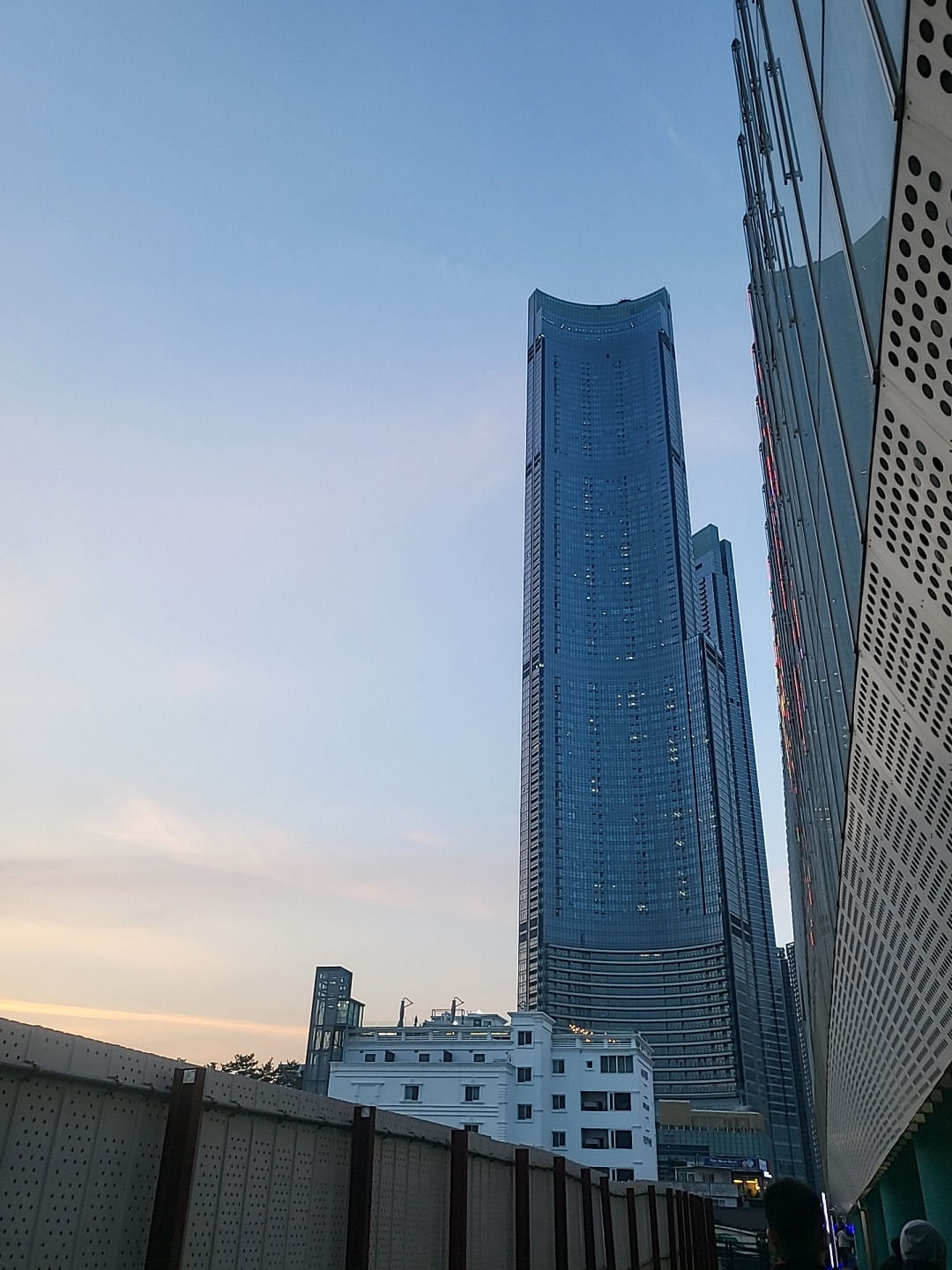 송정 해변에서 미포 정거장으로 돌아가는 길, 노을이 지고 있었다. 오른쪽 사진은 부산 초고층 빌딩 '더베이101'