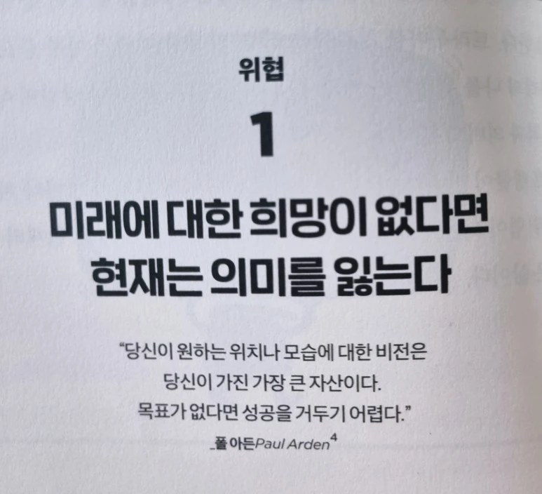 건강하고 성공한 미래를 꿈꾸는 사람은 결코 현재를 포기하지 않는다. 현재에 굳이 필요하지 않는 것들을 절제하고 오히려 꼭 필요한 일에 몰입한다. 그렇게 함으로써 오롯이 현재를 살아가는 만족감과 정돈된 미래, 두 가지를 모두 얻는다. 미래의 목표가 중요한 이유가 바로 여기에 있다.