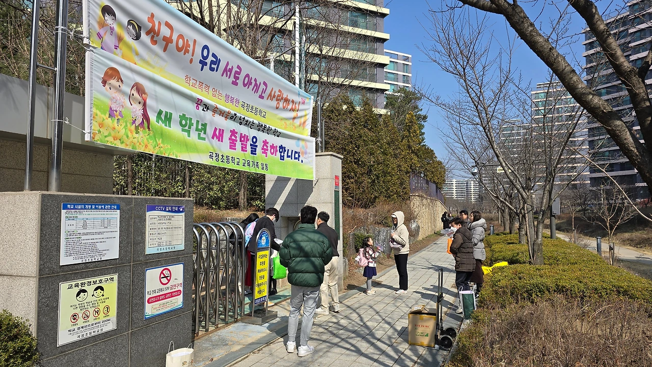 갓 입학한 초등학교 학생들이 밝은 모습으로 부모의 손을 잡고 학교를 나서고 있다.