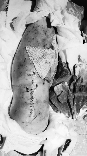 수술 후 처음으로 드레싱 하는 날, 간호사가 가위로 붕대를 자르고 나자 수술한 부위가 보인다. 끔찍했던 낙상사고를 말해주듯 수술한 부분이 못 볼 지경이다. 철심을 박고 살갗을 봉합한 수십 개의 십자 실밥, 2cm 정도 길게 삐져나온 2개의 철심 고정 못이 처참하게 보인다.