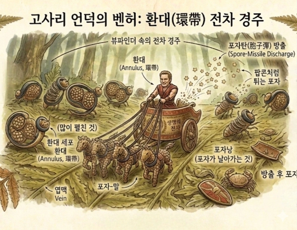 양치식물의 자연사에서는 포자가 튀어 오르는 모습을 '팝콘이 튀는 것 같다'고 묘사한다. 0.25mm의 작은 주머니 속 64개의 포자가 허공으로 2.54cm 이상 솟구치는 장면. 그것은 자손을 퍼뜨리기 위한 고사리의 치열한 의지이자, 난쟁이 나라의 투석기들이 일제히 포탄을 쏘아 올리는 장엄한 전투이기도 하다.