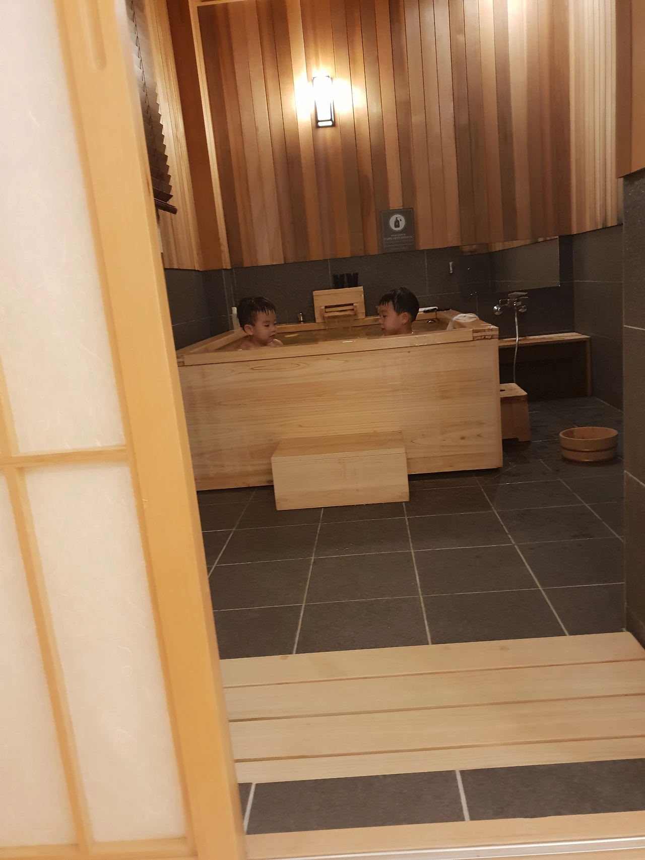 그 시간은 내게 정말 힐링이 되는 시간이었다. 나는 아이들이 히노키 욕조에서 노는 모습을 바라보며 커피를 마셨고, 아이들이 너무 잘 놀자 몰래 방으로 들어가 아주 잠시지만 티비도 봤다(평소 집에서는 전혀 티비를 보지 않는데, 여행가서 보는 티비는 진짜 꿀맛이었다). 길지 않은 시간이었지만 너무 행복했다.