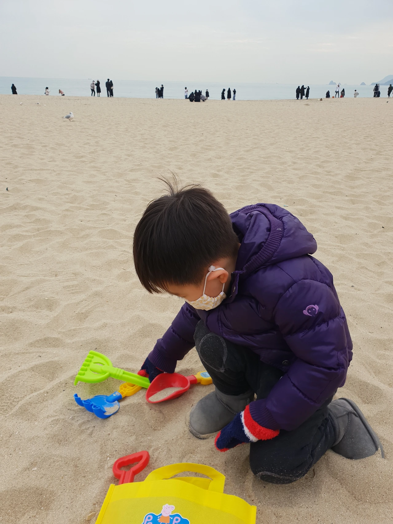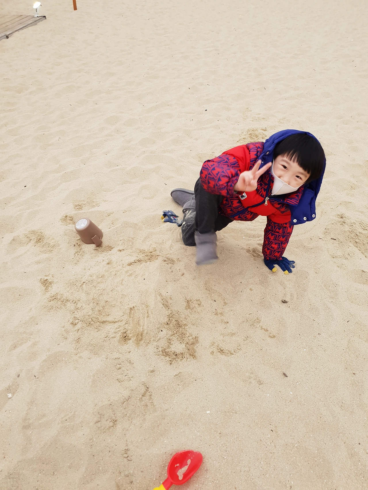 하지만 아들둘과 함께 온 해운대는 정말로 달랐다. 모래놀이를 꼭 해야 하는 아들둘 덕에 차가운 바다바람을 맞으며 모래에 앉아 아이들이 뿌려대는 모래를 머리부터 발끝까지 받아주었고, 물이 필요하다는 첫째를 위해 바닷물을 뜨러갔다가 한 발이 물에 빠지는 참사를 겪고도 내 발이 차가운지도 모르고 아들둘을 챙겼다. 코로나라 식사는 호텔방에서 했는데, 집에서 가져온 아이들 식판을 꺼내 포장해온 김밥과 어묵을 나눠 담아주고, 먹기 좋게 잘라서 입에 넣어주었다. 나도 배가 고프지만, 중간에 물 달라 우유 달라, 음식 크기가 크다 작다하는 아이들시중을 들다보면 배고픈 것도 잊어버린다. 아이들이 배가 좀 차면 나는 아이들이 남긴 음식을 허겁지겁 먹는다.