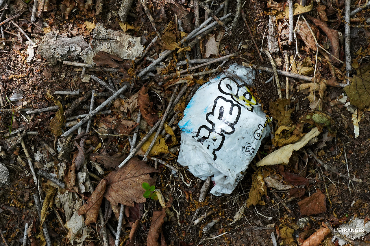 산 중턱에서 발굴한 라면과 과자 봉지들. 지금은 모를 이름도 있다. 취사의 흔적일 수도 있겠다