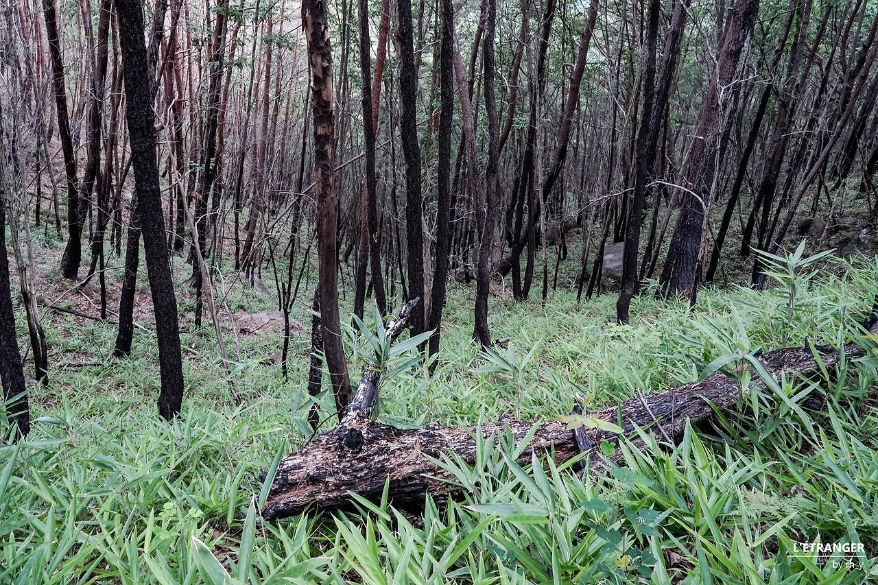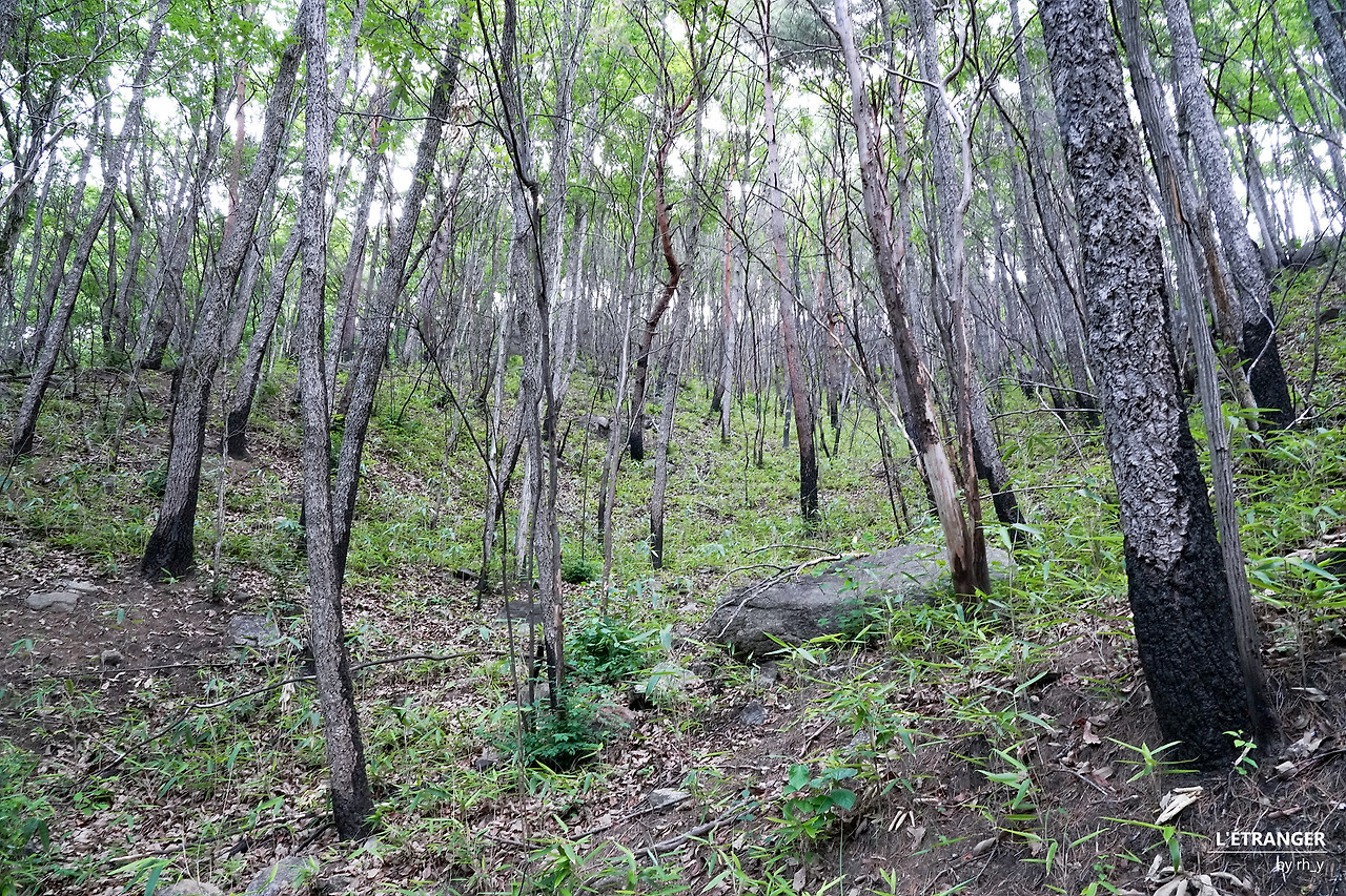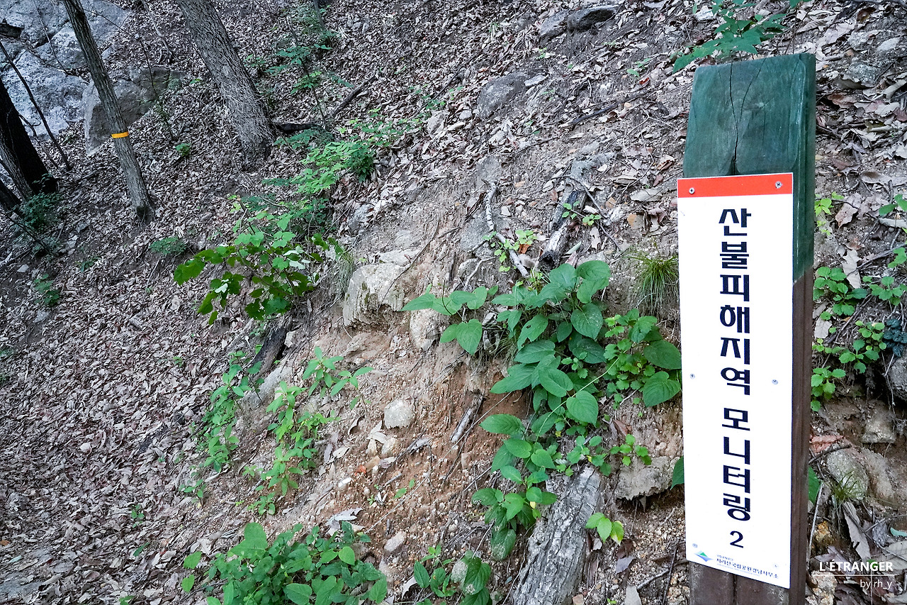 멀리 보이는 산불의 흔적산에 불을 들이면 불이 날 수 있다. 수도꼭지만 틀면 물이 나오는 도시가 아닌, 산에서 난 불은 끄기가 무척 어렵다. 지극히 상식적이다. 탐방로 구석구석에 설치된 현수막의 흡연/취사/샛길 탐방 금지와 같은 문구에서는 상식에만 온전히 의지할 수 없다는 불안이 묻어난다. 불안은 지나친 걱정에 그치지 못하고, 산의 쉴 만한 곳마다 심지어 푯말 바로 아래에서도 담배꽁초가 흔히 발견되는 현실이 되었다.