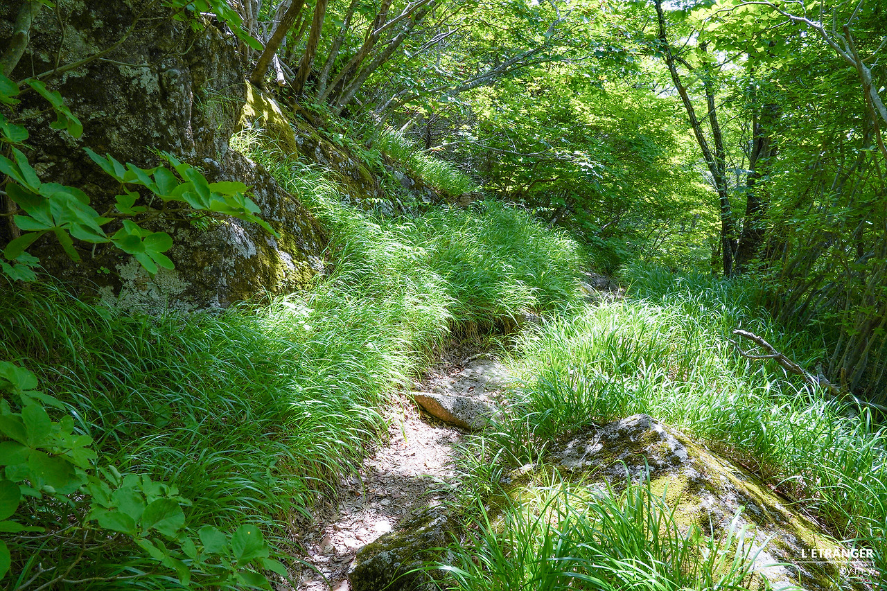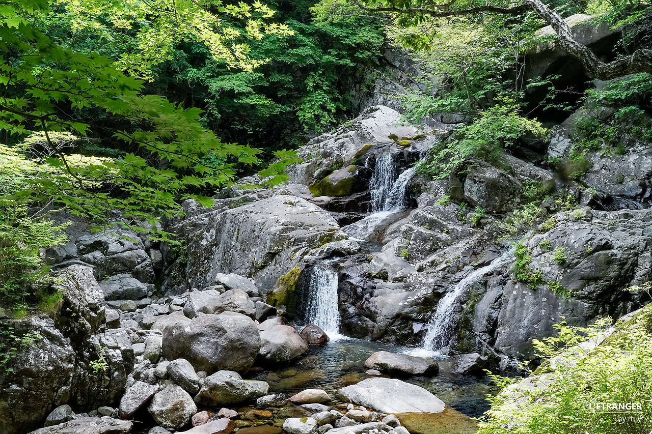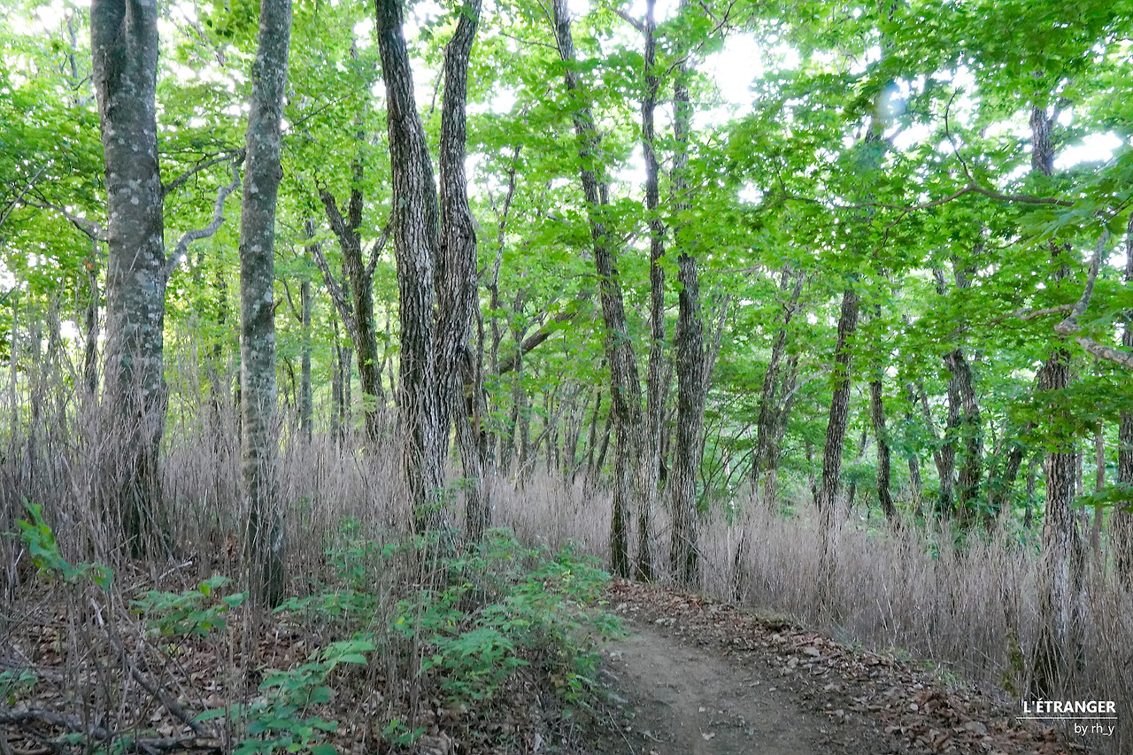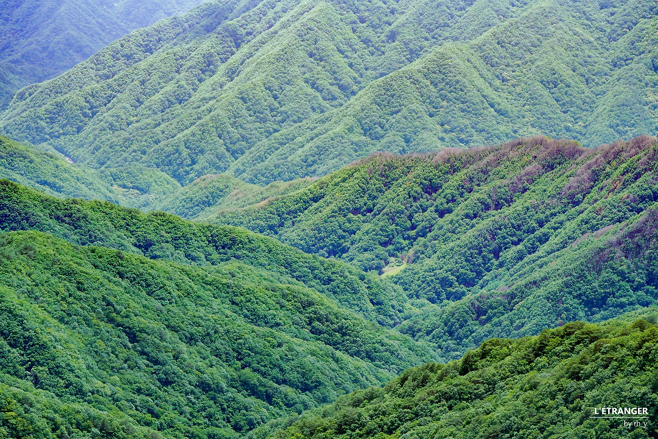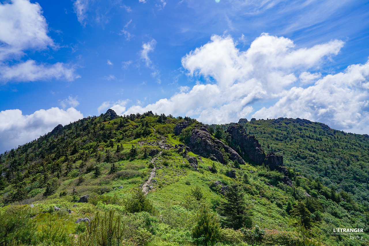 세석대피소에서 음양수를 지나 남부 능선을 따라 걷는 길은 한동안 고도를 크게 높이거나 낮추지 않는다. 나무와 풀의 만발한 초록이 한들거리고, 그 사이로 햇빛이 드리운 길은 고즈넉하고 안온하다. 동서로 뻗은 능선의 가운데에서 남쪽을 향한 길을 걷다 뒤돌아선다. 마주 본 촛대봉과 영신봉 위로 지나는 구름 사이에 서 있으니, 신선이거나 혹은 무어라도 된 듯한 착각에 잠시 빠진다.
