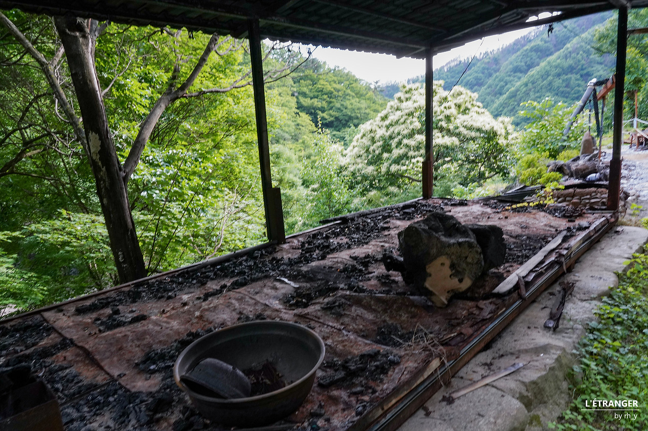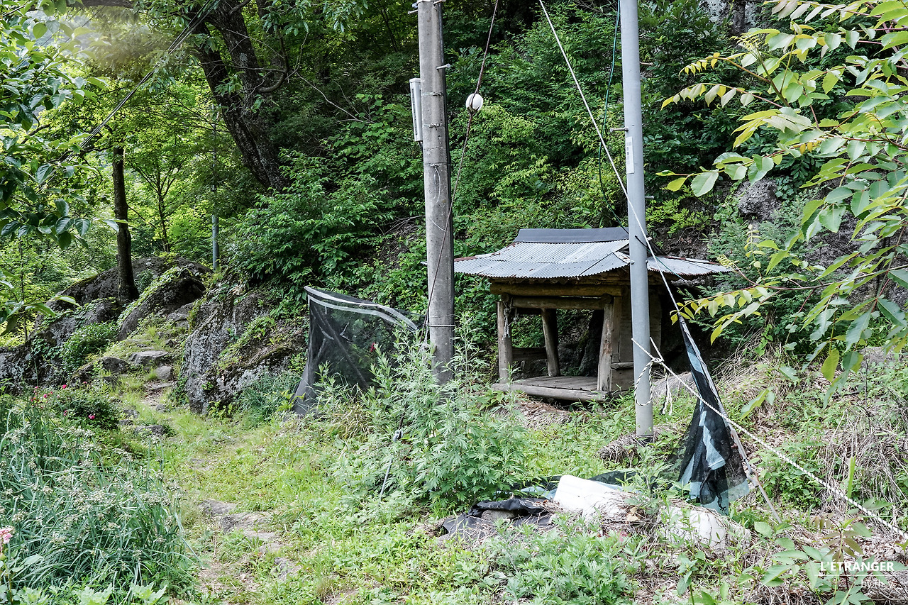 마주본 두 봉우리2023년 3월 산불은 해발고도 600m 중턱쯤부터 체감된다. 탐방로 가까이에서 시야가 닿는 제법 먼 곳까지 그을린 나무들이 서 있고, 드문드문 모조리 불탄 나무의 밑동 옆으로 숱한 세월을 지났을 굵은 나무줄기가 쓰러져있다. 종종 산객이 쉬어 가던 산속 민가 두 채는 모조리 불에 탔고, 갈 곳 잃은 잔해가 켜켜이 쌓였다. 민가 끝에 묶여 사납게 짖던 개는 이제 없고, 빈 개집만 남았다.