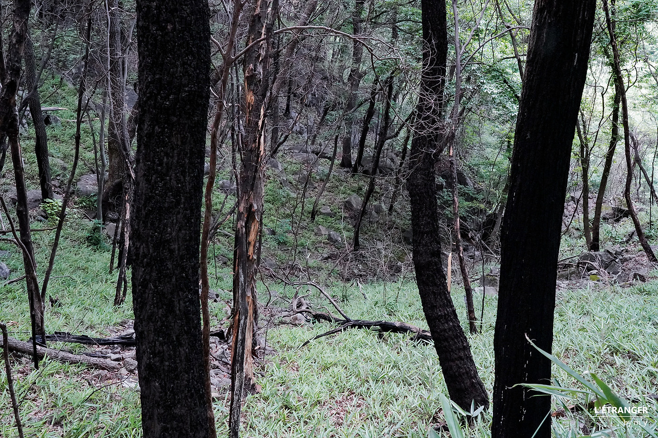 1년이 지난 숲에서는, 살아남은 뿌리로 흙을 지탱하던 조릿대가 펼친 잎이 나무 사이로 바람에 잔잔하게 물결친다. 초록과 초록이 모인 이맘때의 여느 숲과는 달리, 움트기 시작한 연초록은 검게 그을린 나무의 색과 두드러진 대비를 이룬다. 사람의 손길이 닿지 않은 숲은 저 스스로를 지킬 힘을 길렀고, 기어이 서로를 일으켜 함께 살아낸다.