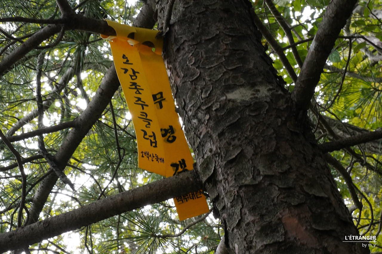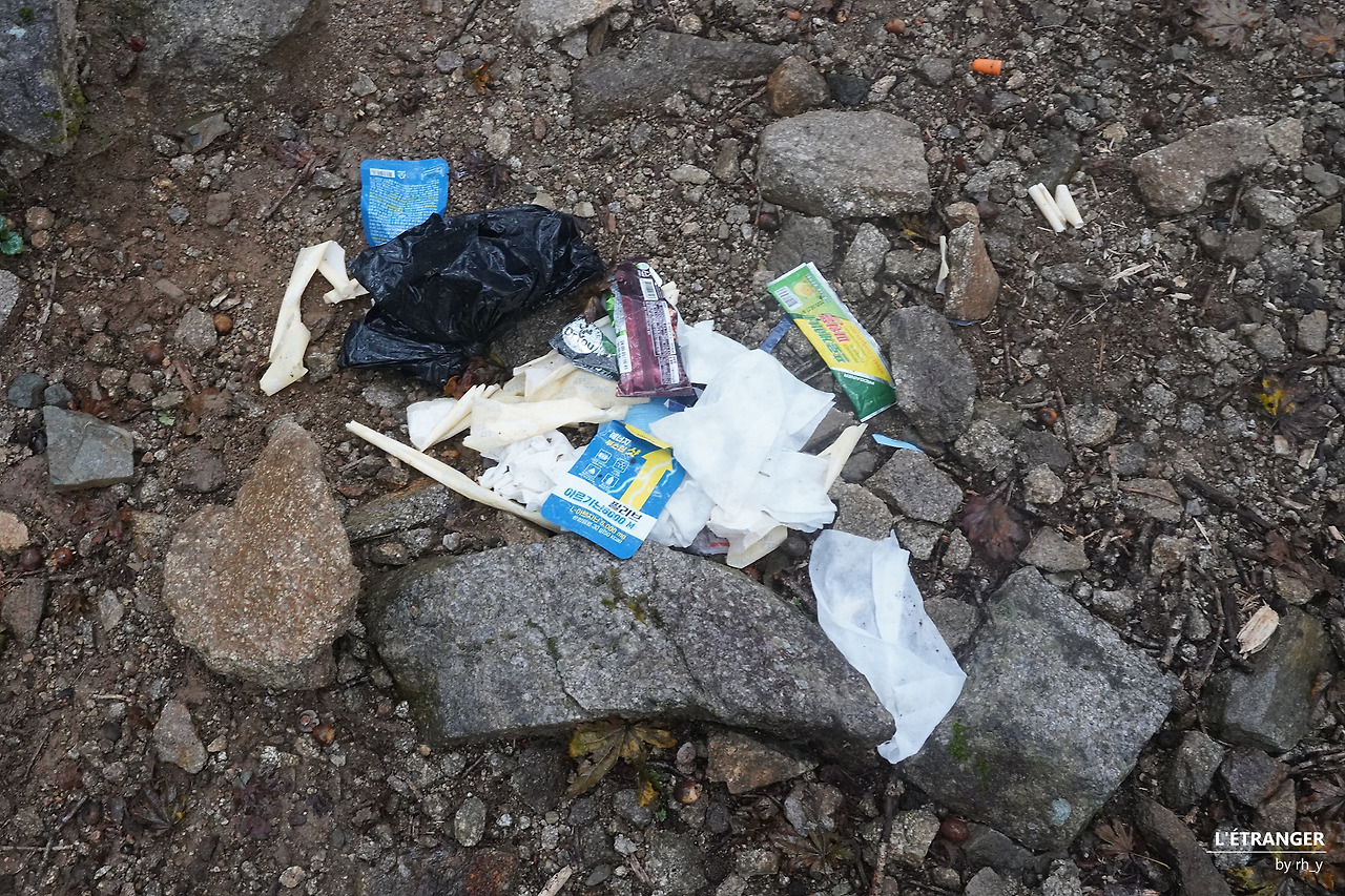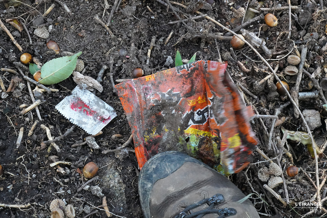 급하게 걸음을 옮기는 와중에도 '흐린 눈'으로 지나칠 수 없는 것들이 있다. 나뭇가지에 이질적으로 매여 있는 산악회 리본, 버젓이 잘 서 있는 이정표 아래로 자신들의 행로를 표시해 두고 가져가지 않은 종이, 실컷 먹고 놀고 나서 일말의 양심도 없이 그대로 버리고 간 쓰레기는 날이 흐리고 어두워져도 곧잘 눈에 든다.