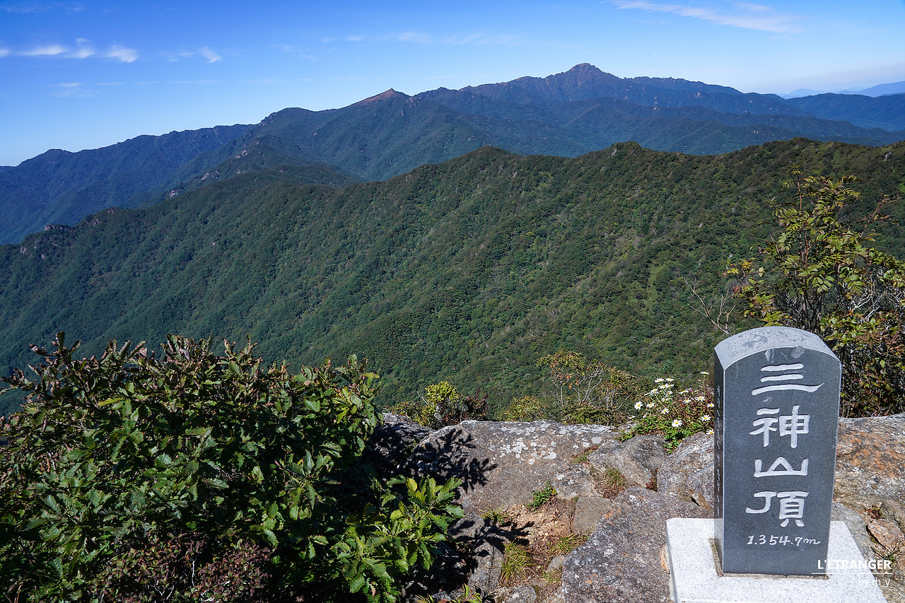 제단처럼 켜켜이 쌓은 돌 위로 삼신봉 표지석이 보인다. 조선 말기와 일제강점기 때 지리산에 들어와 살던 정걸방이라는 도인이 쌓았다는 이야기가 전해진다. 평편한 돌 위에 걸터앉아 있으니 한 산객이 올라와 정상석에 가져온 생수를 놓고 정성스레 기도를 올린다. 인근에 살았던 그는 다른 지역에 사는 지금도 이 산을 잊지 못해 종종 찾는다고 했다.