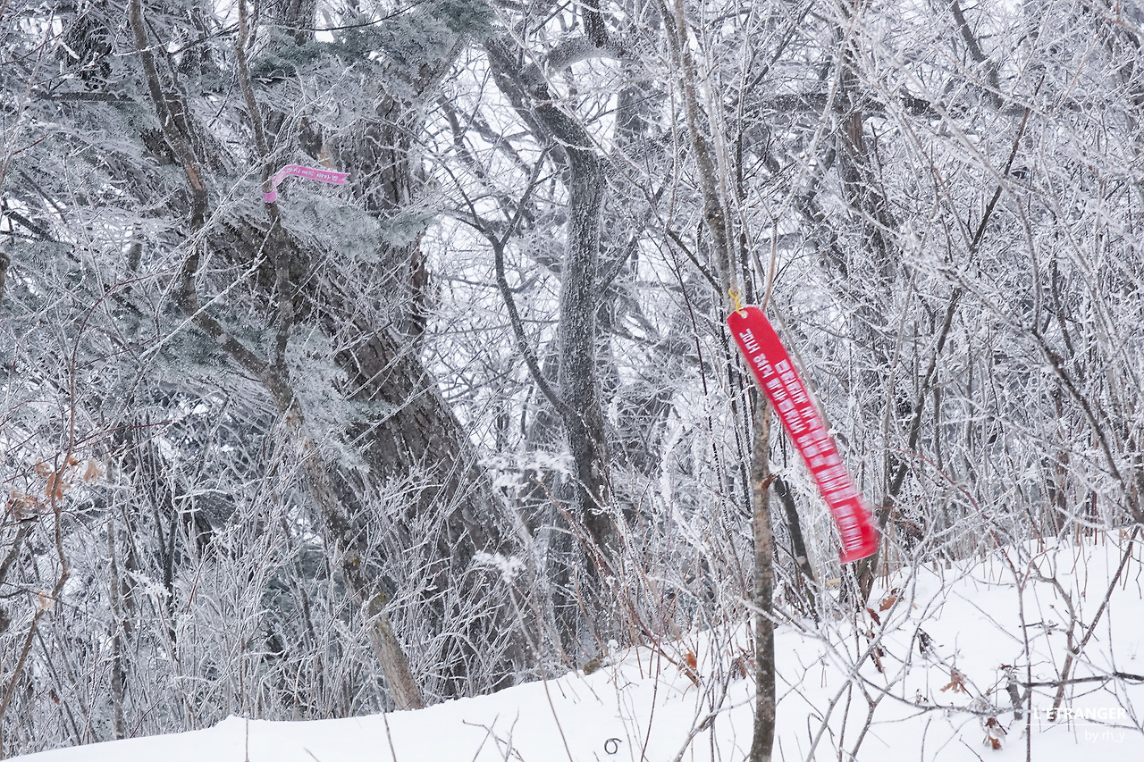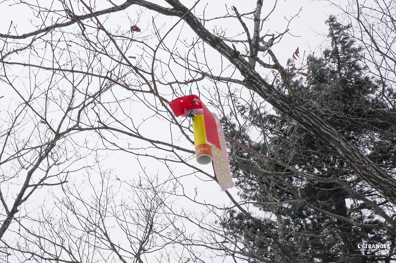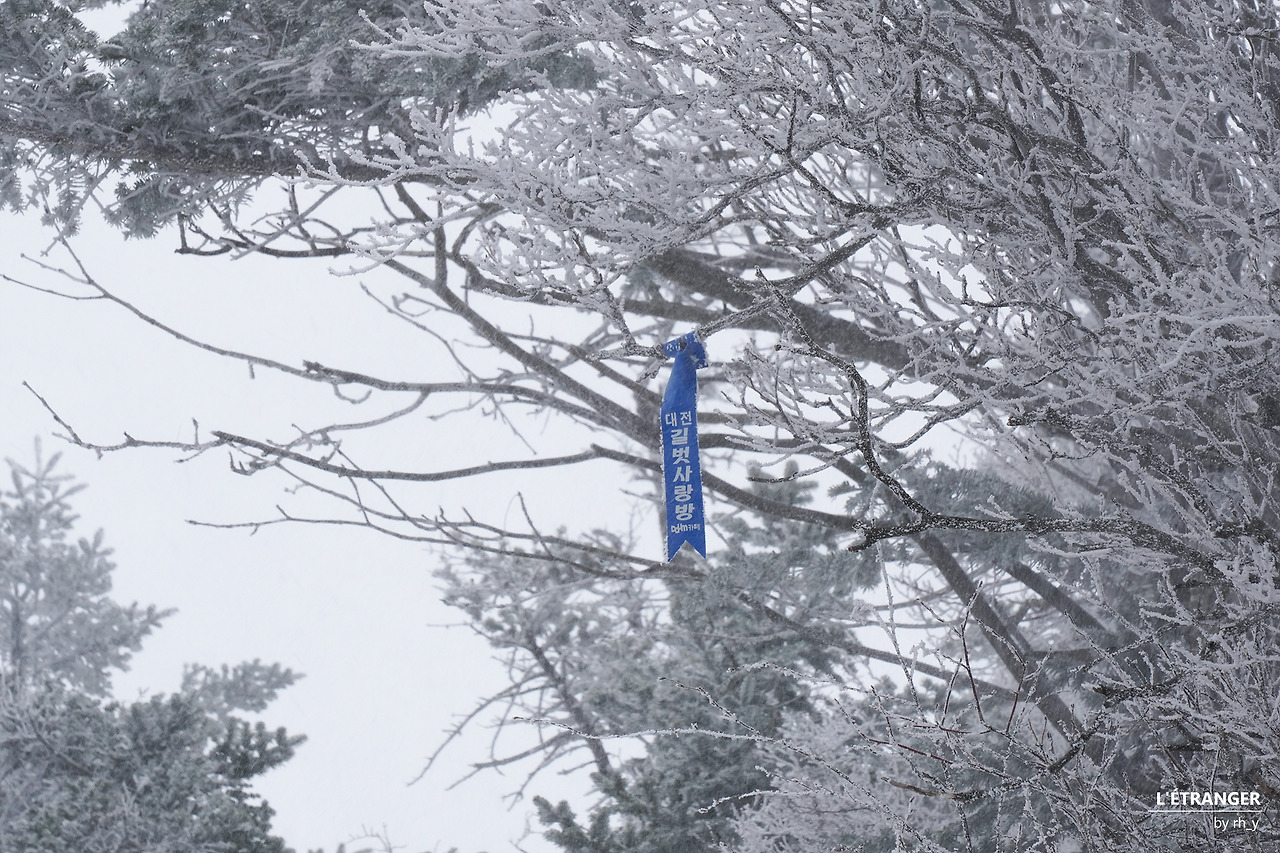 국립공원에서는 안전을 위해 탐방로의 시야가 미치는 범위 곳곳에 표식을 설치해 뒀다. 그 옆으로, 사이로 빈 가지를 찾아 썩지도 않는 형형색색의 등산리본이 여기저기 흉측하다.