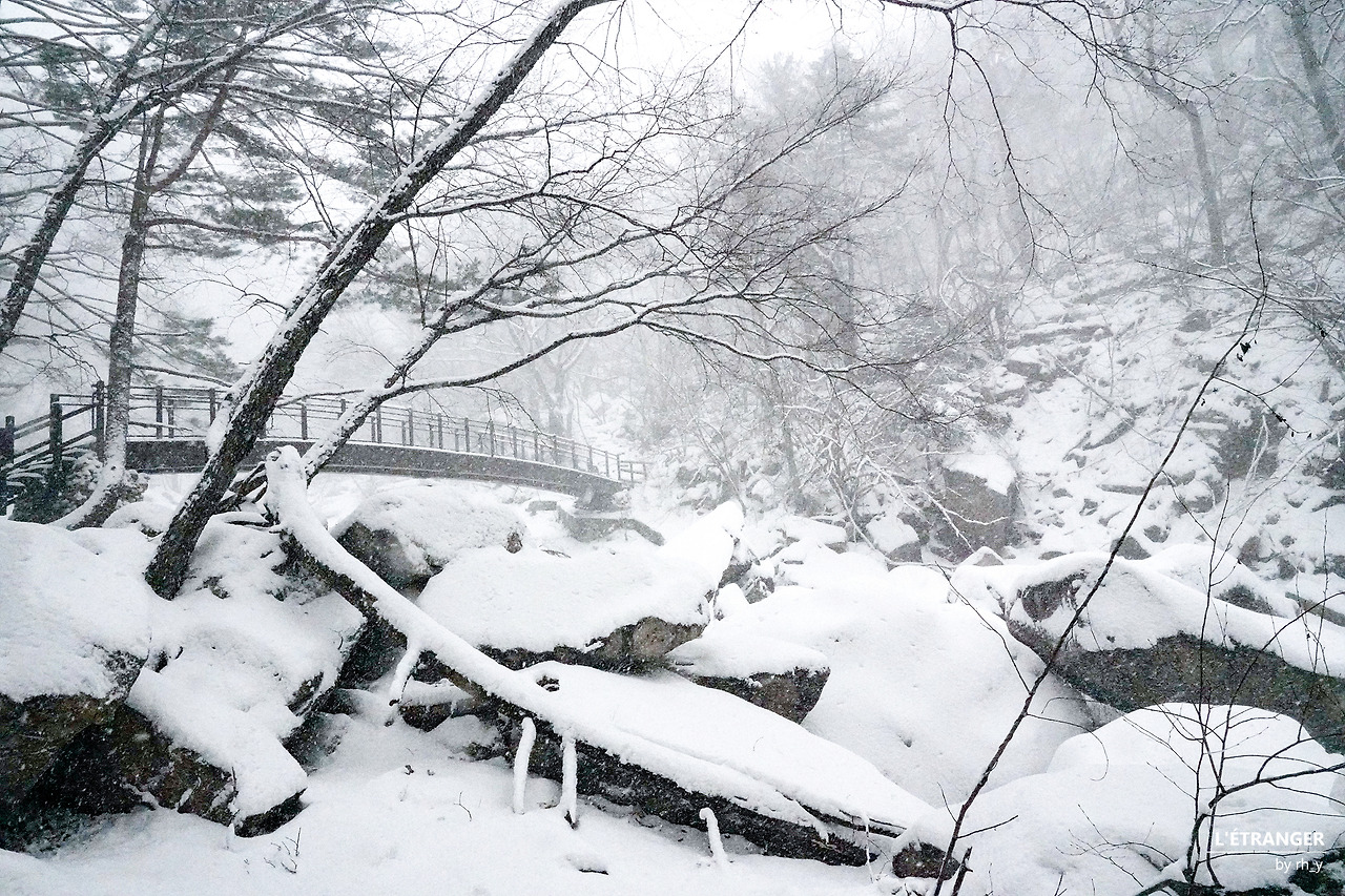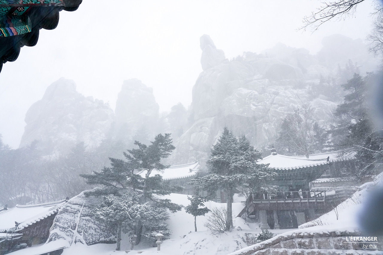 눈이 쌓인 길의 첫걸음은 그 깊이와 정도를 가늠할 수 없다. 발이 닿는 곳까지 조심스레 무게를 실어 딛고 빼내기를 거듭하는 동안, 두 눈은 부지런히 다음 디딜 곳을 탐색한다. 순간적이고 동시다발적인 몸의 작용에서 균형을 잃으면, 발끝의 얼음에 갑자기 미끄러지거나 부지불식간에 방향을 잃고 엉뚱한 곳으로 힘겹게 발자국을 내며 나아가버리고 만다. 장갑을 겹으로 둘러도 시리던 손끝까지 열이 올라 길가에서 여장을 정리하는 동안 뒤따라온 산객 셋과 앞서거니 뒤서거니 하며 나아가는 길은 수고로움이 적다.