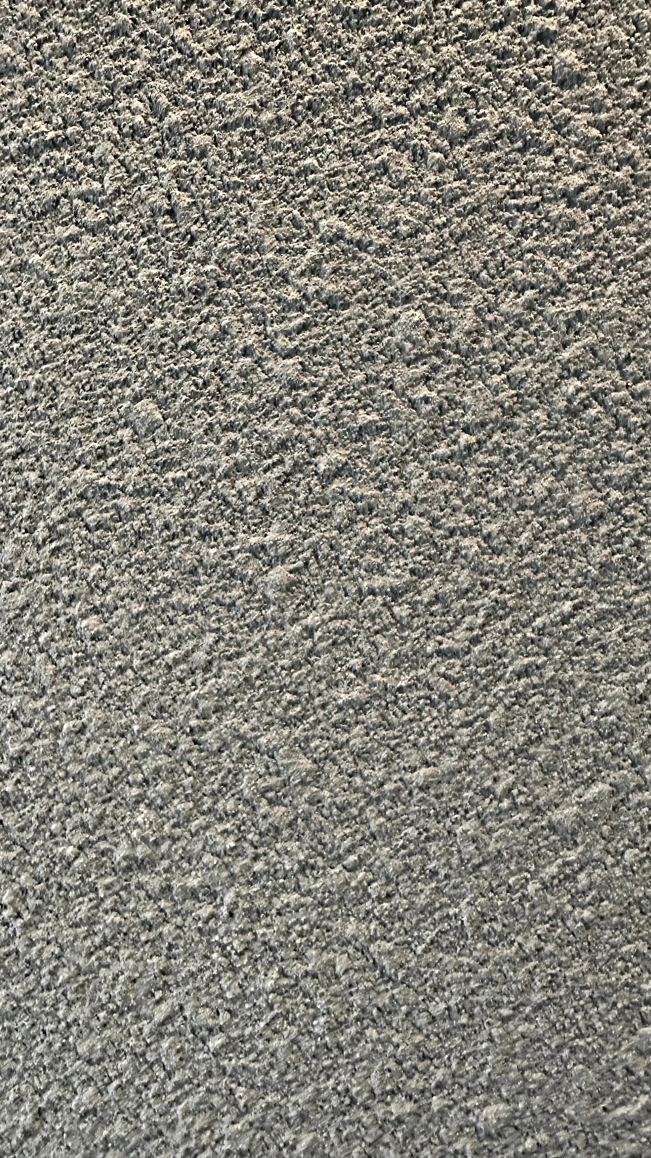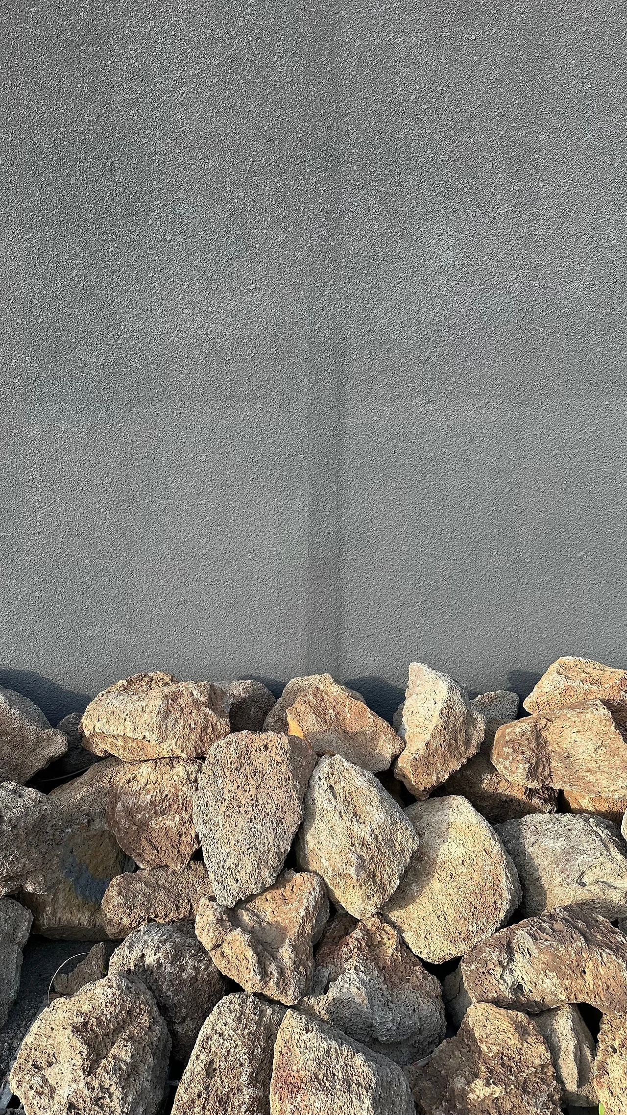 외관 특징: 회색 콘크리트 박스, 수직 타일 장식, 돌 조경과 식재