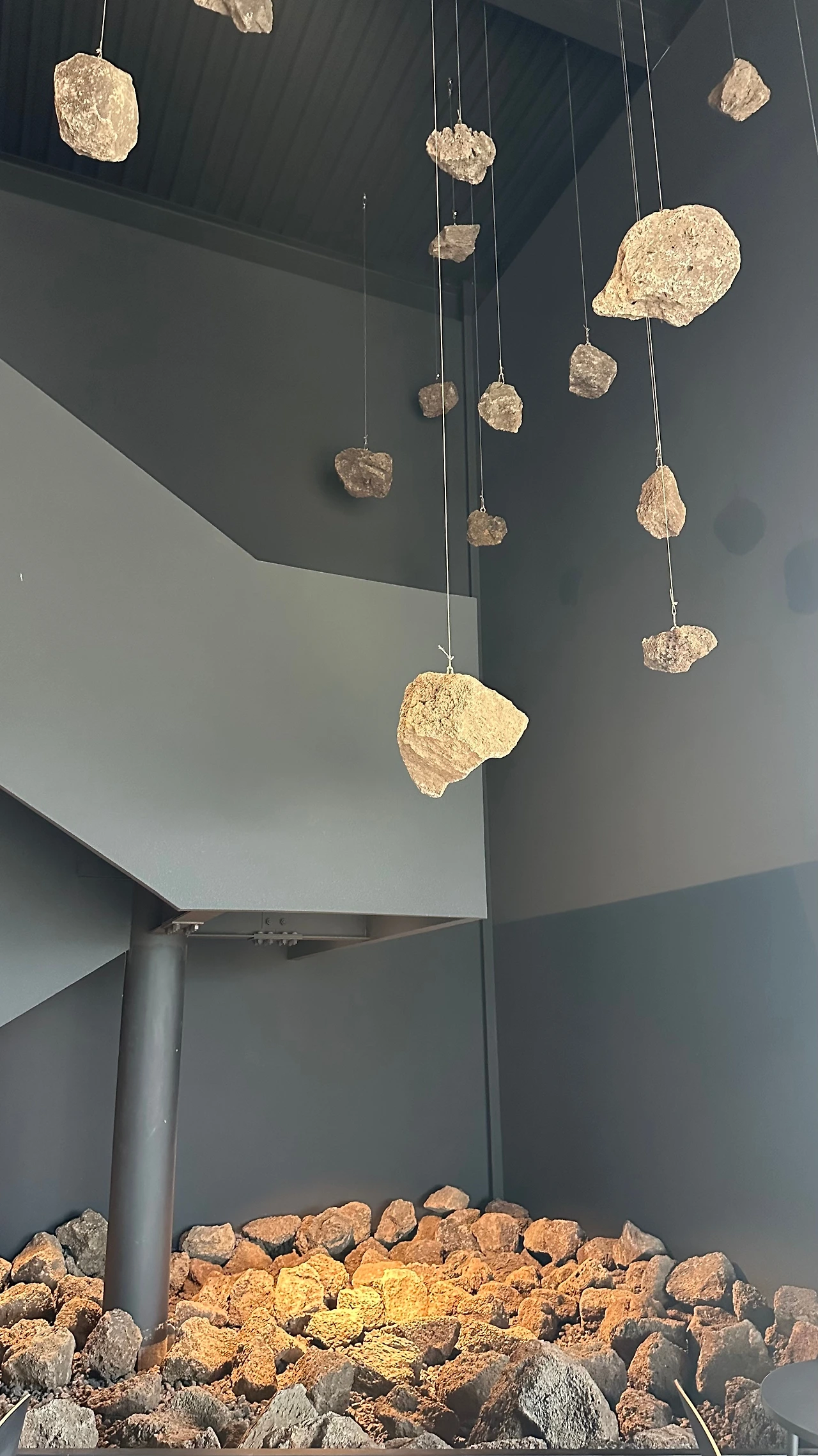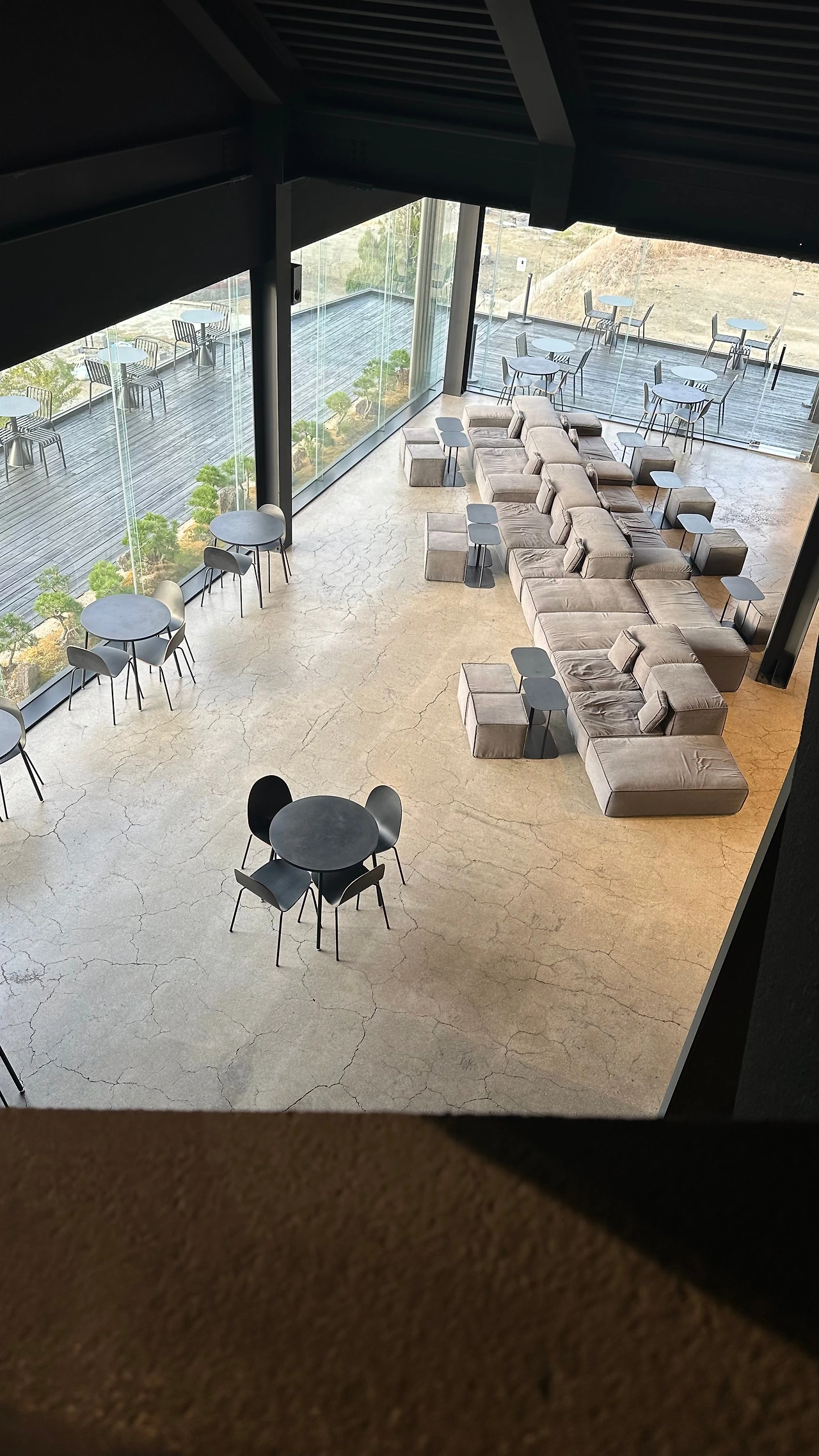 실내 분위기: 높은 층고, 무채색 톤, 깊은 조도, 곡면 벽