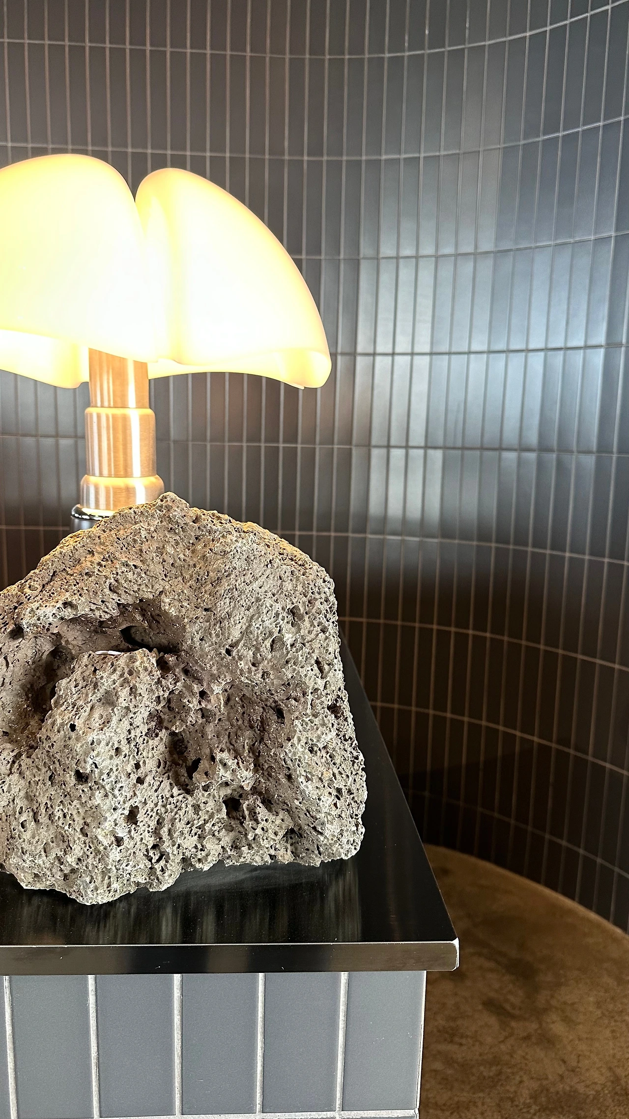 무채색 콘크리트, 낮은 소파, 깊은 조도.