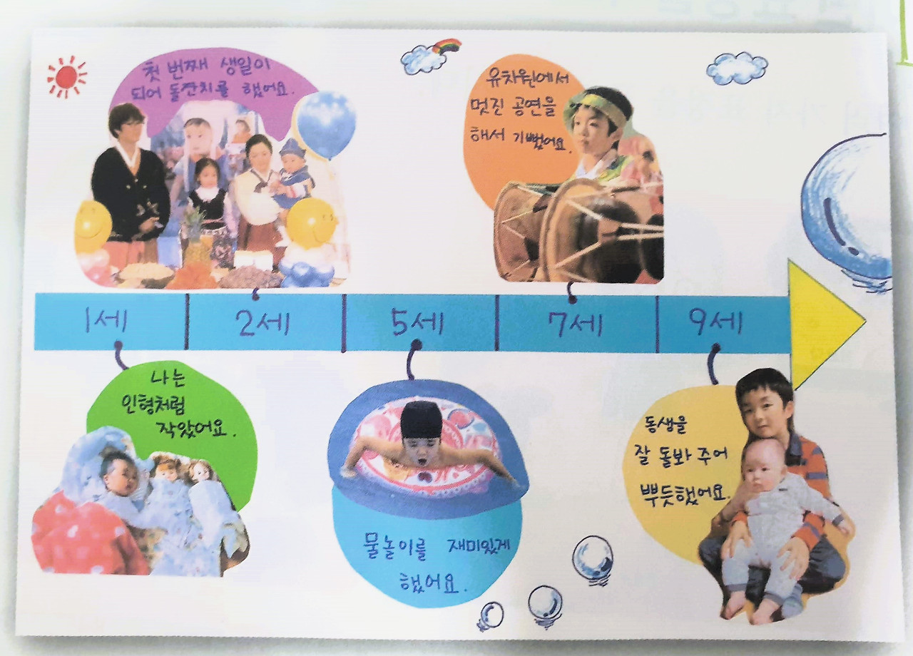 3월 말에 우리는 '성장흐름표'라는 걸 만들기로 했다. 9살까지 나름대로 긴 인생을 살아오면서 몇 살에는 어떤 모습이었고 무엇을 했는지 적어보는 활동이다. 우리가 어렸을 적 배웠던 바른생활/슬기로운 생활/즐거운 생활이 요즘은 하나로 묶여있는데, 이를 통합교과라고 부른다. 통합교과에선 인식의 범위를 나->가족->이웃->나라로 확장해 가며 내 주변 세상에 대해 이해하도록 돕는다. 성장흐름표는 '나'의 역사를 한눈에 볼 수 있도록 간단히 꾸며보는 활동인 셈이다.