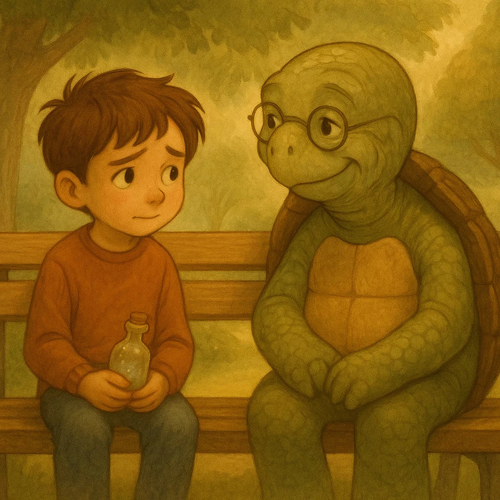 그때 느리게 다가오는 거북이 한 마리가 민수의 곁에 천천히 앉았다. 민수는 처음엔 그 거북이를 보지 못했지만, 거북이의 나직하고 부드러운 목소리가 들려왔다.
