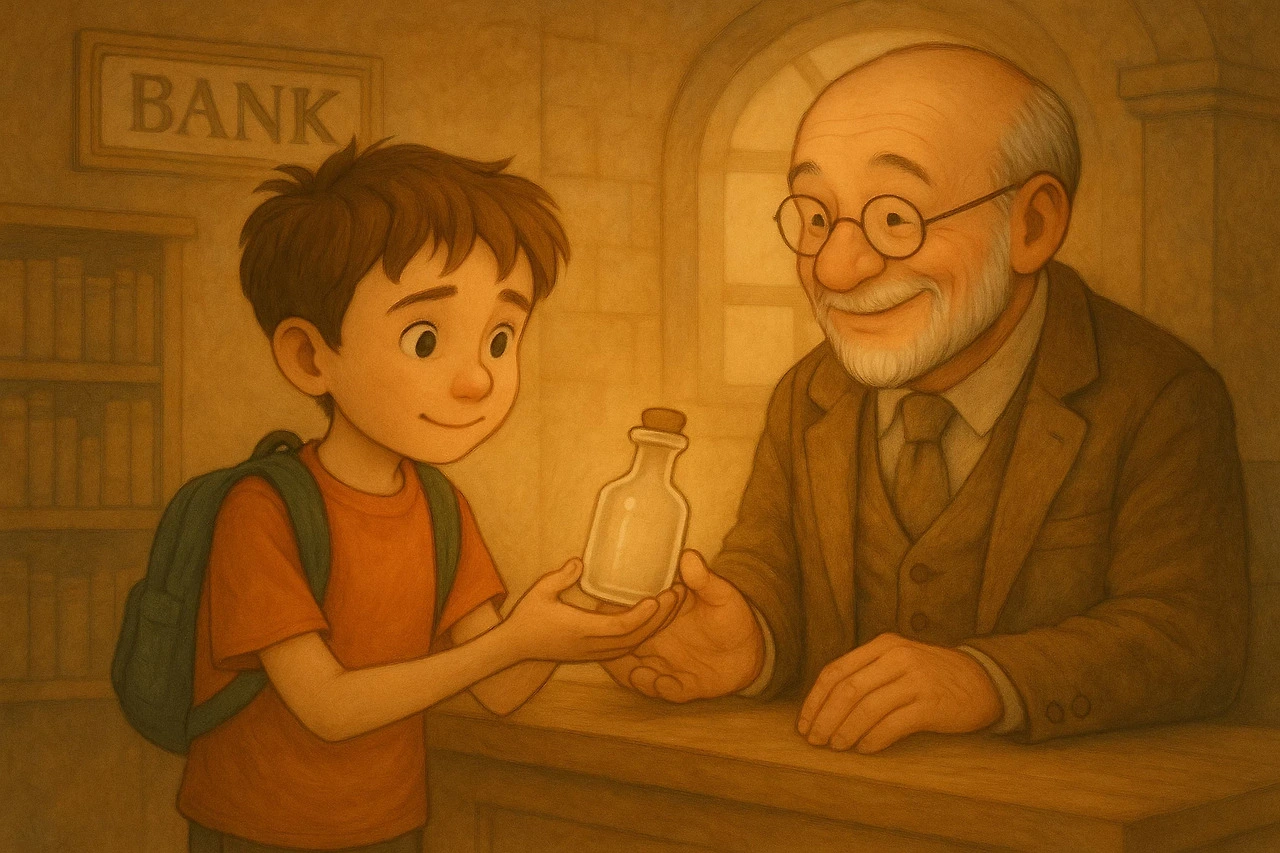 그날 저녁 민수는 다시 거짓말 은행을 찾아갔다. 손에는 차갑게 식어버린 병이 있었다. 은행원 아저씨는 민수를 따뜻한 미소로 맞았다.