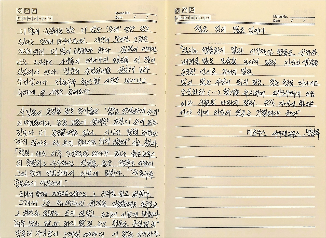 아우렐리우스와 라이언은 우리의 이런 현실을 이미 알기라도 했듯이 '말 많음'을 경계하고 있다. 되도록 말하지 않는 것이 너무 많은 것보다 낫다고까지 말한다. 백 번 옳은 말, 하지만 좀처럼 고치기 어려운 충고다. 한편 말하면 녹음하고, 글로 남기면 저장을 하니 '누굴 믿고 뭔 말을 하나?' 하는 경계심을 키우는 요즘이다. 게다가 툭 하면 '고소, 고발'을 일삼는 형국이니, 제 아무리 이것들이 '선진국병'이라고 하지만 정도가 심하다는 생각을 지울 수가 없다.