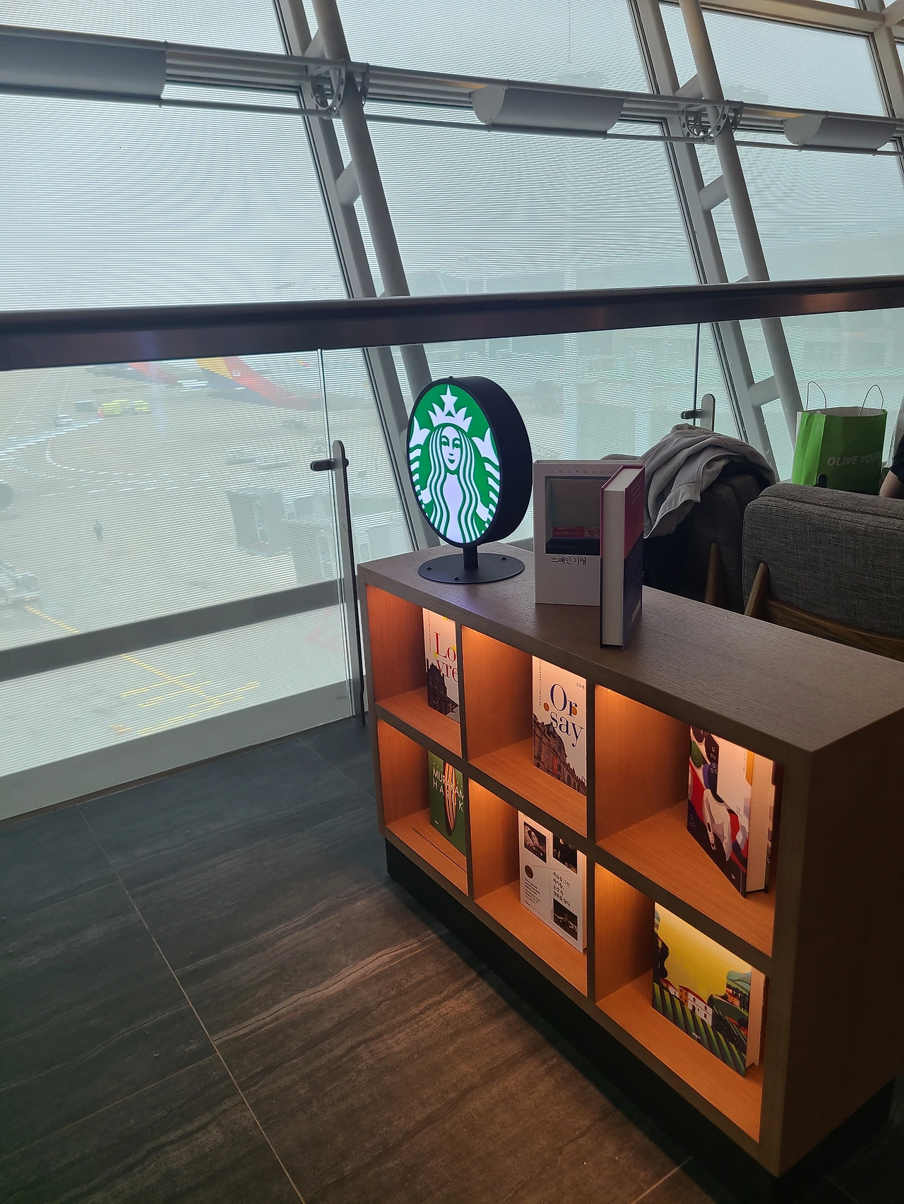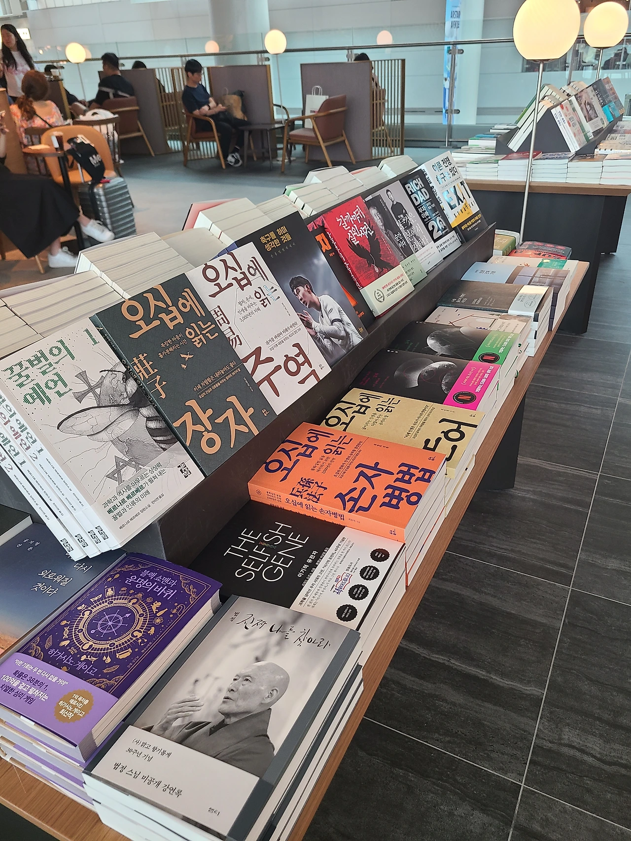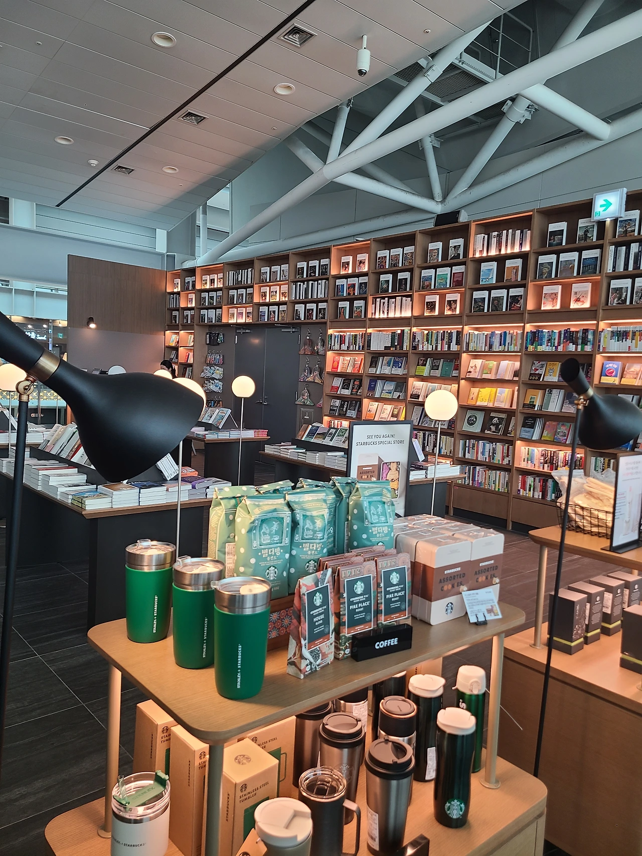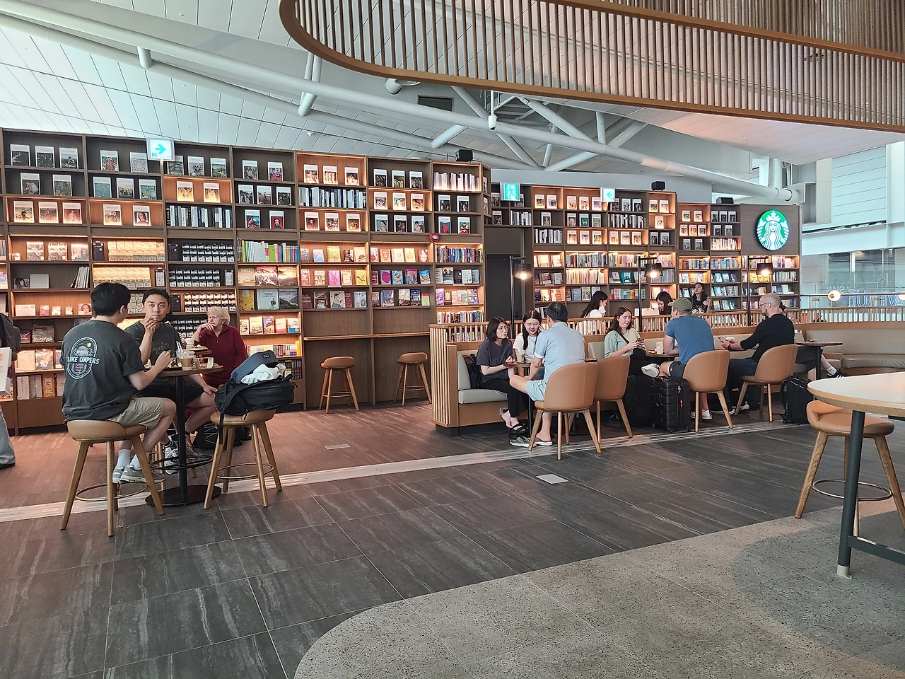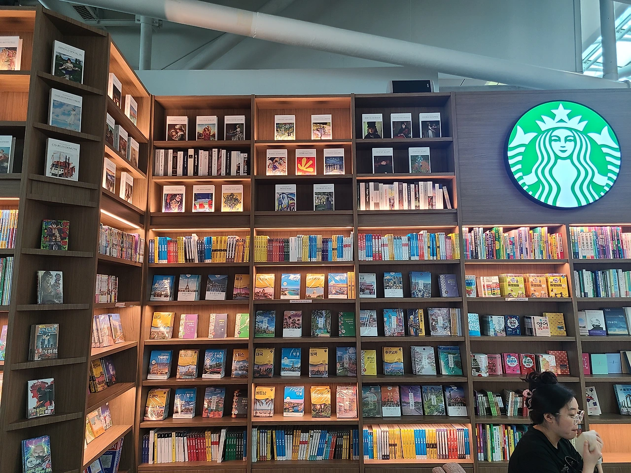 한번쯤 생각했을 법한 바램이 이뤄진 셈이다. 일본의 유명 서점 츠타야 매장 한가운데 스타벅스가 있어 커피를 마시며 커피를 마신다면, 이곳은 커피집 안에 서점을 둔 셈이다. 보기에만 좋은 장식용 책장이아닌, 공항에 어울리는 여행책과 사진집 그리고 비행기를 기다리며, 비행기에서 읽을 만한 베스트셀러와 스테디셀러가 구비되어 있다.