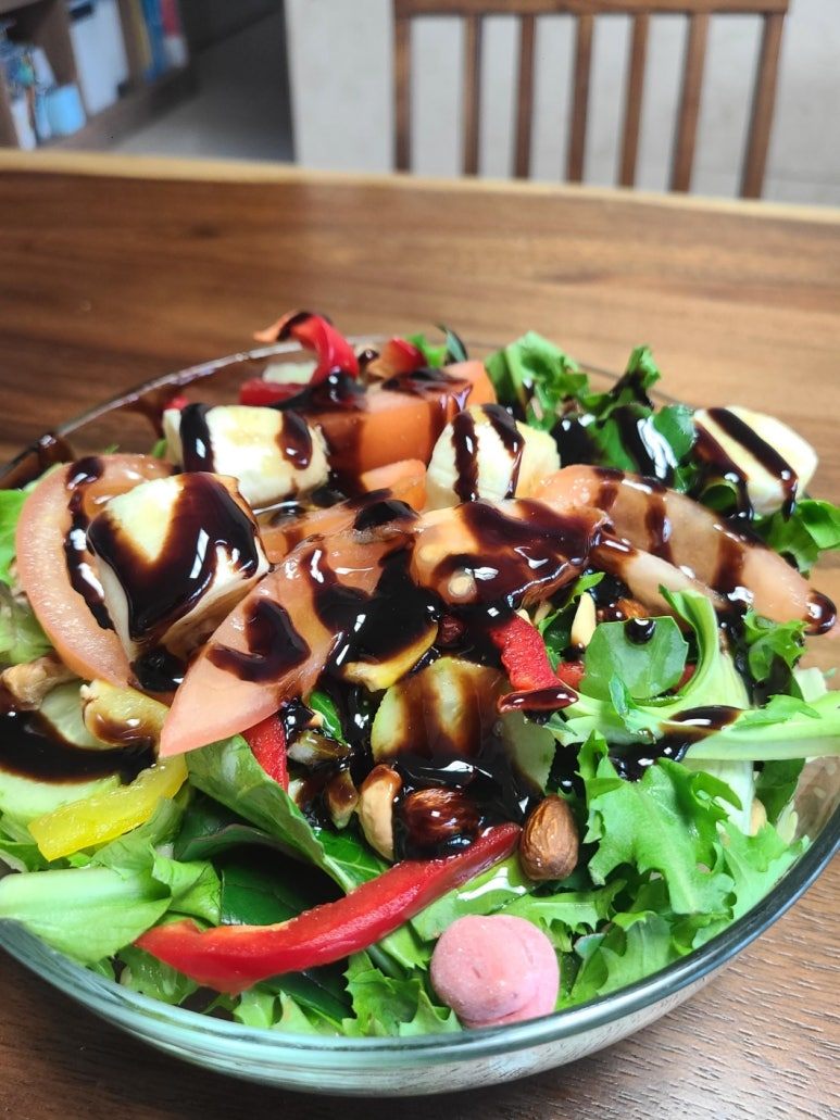 점심은 싱싱한 채소와 견과류, 올리브와 살사믹 소스를 넣은 샐러드를 먹는다.